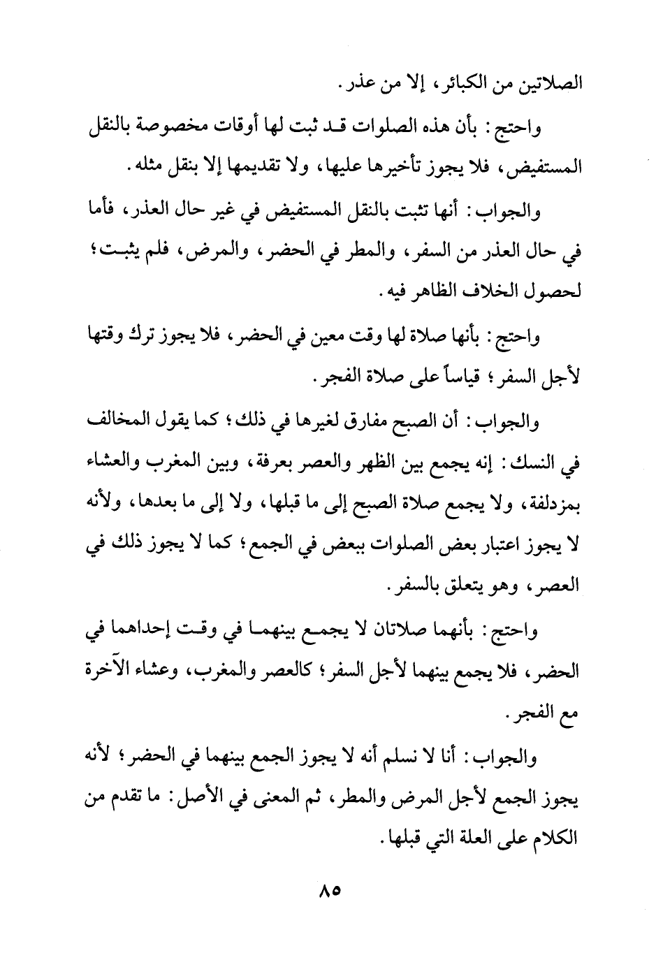 والجواب: أن الصبح مفارق لغيرها في ذلك؛ كما يقول المخالف في النسك: إنه يجمع بين الظهر والعصر بعرفة، وبين المغرب والعشاء بمزدلفة، ولا يجمع صلاة الصبح إلى ما قبلها، ولا إلى ما بعدها، ولأنه لا يجوز اعتبار بعض الصلوات ببعض في الجمع؛ كما لا يجوز ذلك في العصر، وهو يتعلق بالسفر.