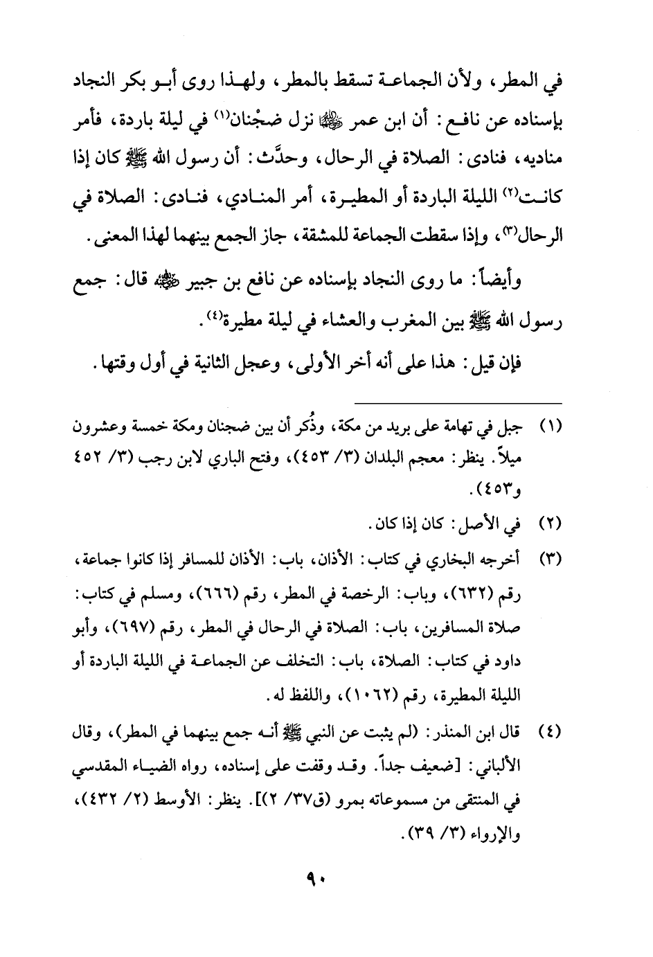 (¬4) قال ابن المنذر: (لم يثبت عن النبي - صلى الله عليه وسلم - أنه جمع بينهما في المطر)، وقال الألباني: [ضعيف جدًا. وقد وقفت على إسناده، رواه الضياء المقدسي في المنتقى من مسموعاته بمرو (ق 37/ 2)]. ينظر: الأوسط (2/ 432)، والإرواء (3/ 39).