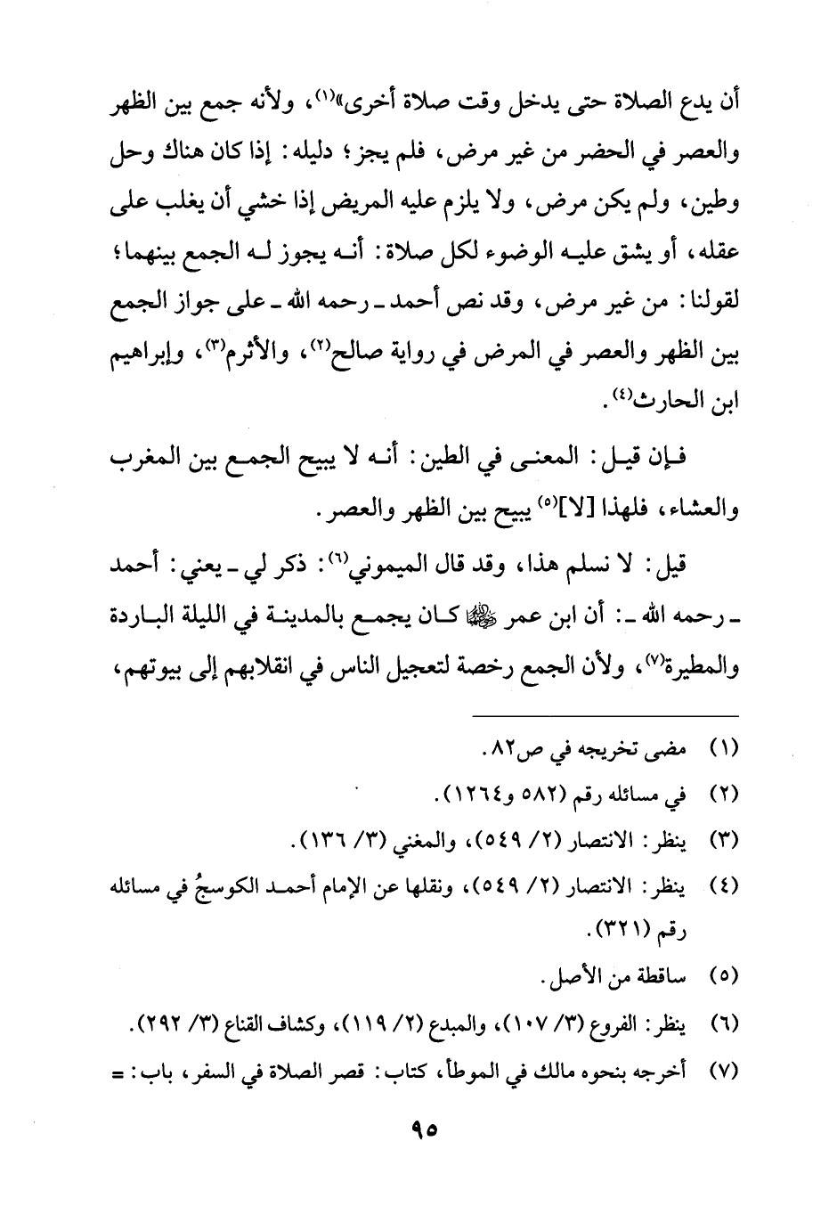 قيل: لا نسلم هذا، وقد قال الميموني (¬6): ذكر لي - يعني: أحمد - رحمه الله -: أن ابن عمر - رضي الله عنهما - كان يجمع بالمدينة في الليلة الباردة والمطيرة (¬7)، ولأن الجمع رخصة لتعجيل الناس في انقلابهم إلى بيوتهم،
