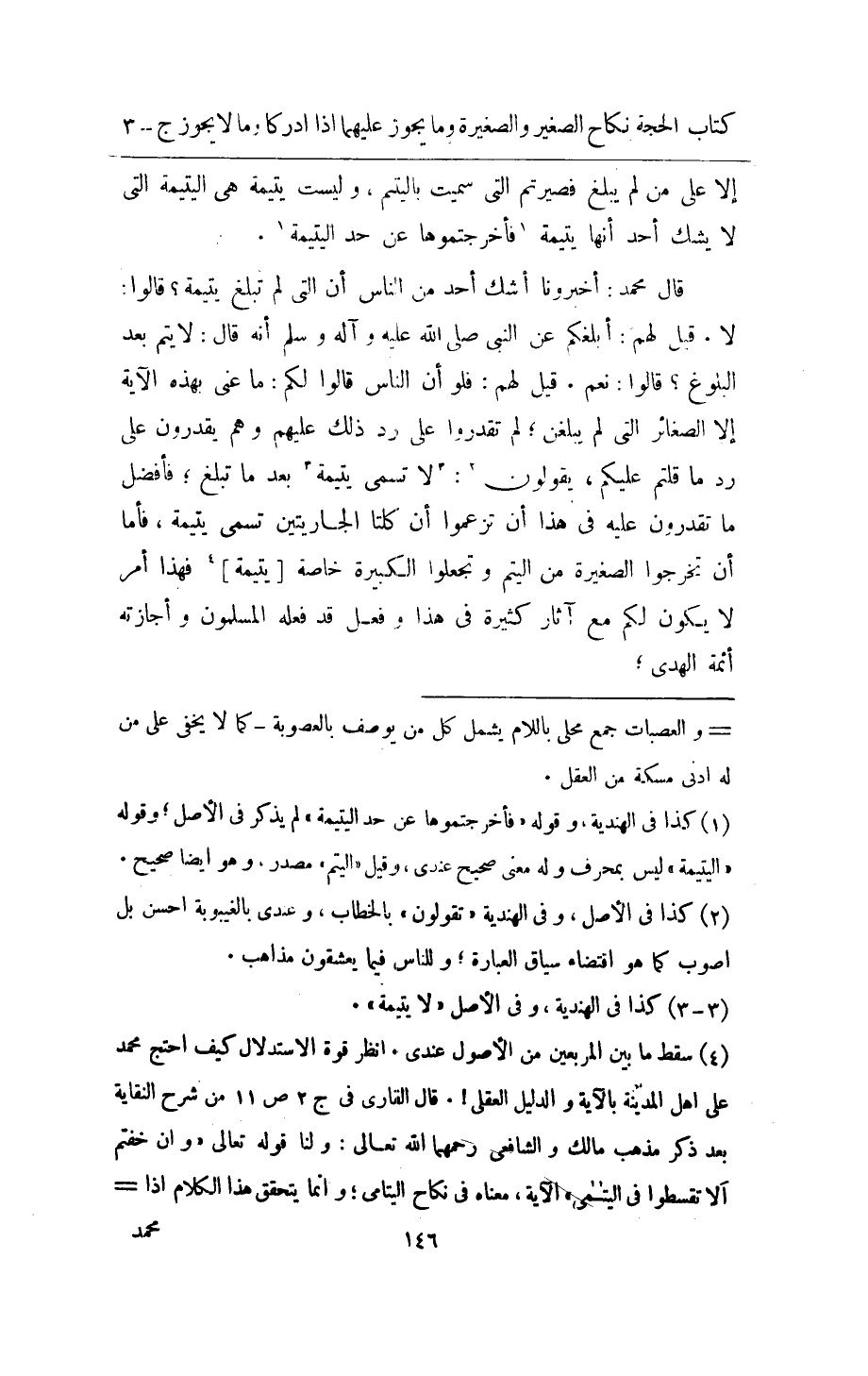 قَالَ مُحَمَّد اخبرونا اشك اُحْدُ من النَّاس ان الَّتِي لم تبلغ يتيمة قَالُوا لَا قيل لَهُم ابلغكم عَن النَّبِي صلى الله عَلَيْهِ وَسلم انه قَالَ لَا يتم بعد الْبلُوغ قَالُوا نعم قيل لَهُم فَلَو ان النَّاس قَالُوا لكم مَا عَنى بِهَذِهِ الْآيَة إِلَّا الصَّغَائِر الَّتِي لم يبلغن لم تقدروا على رد ذك عَلَيْهِم وهم يقدرُونَ على رد مَا قُلْتُمْ علكيم يَقُولُونَ لَا تسمى يتيمة بعد مَا تبلغ فأفضل مَا تقدرون عَلَيْهِ فِي هَذَا ان تزعموا ان كلتا الجاريتين تسمى يتيمة فَأَما ان تخْرجُوا الصَّغِيرَة من الْيُتْم وتجعلوا الْكَبِيرَة خَاصَّة يتيمة فَهَذَا امْر لَا يكون لكم مَعَ آثَار كَثِيرَة فِي هَذَا وَفعل قد فعله الْمُسلمُونَ واجازته ائمة الْهدى