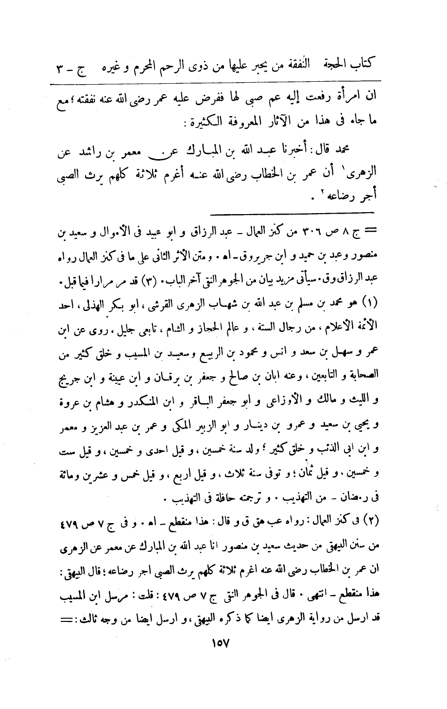 مُحَمَّد قَالَ اُخْبُرْنَا عبد الله بن الْمُبَارك عَن معمر بن رَاشد عَن الزُّهْرِيّ ان عمر بن الْخطاب رَضِي الله عَنهُ أغرم ثَلَاثَة كلهم يَرث الصَّبِي اجْرِ رضاعه