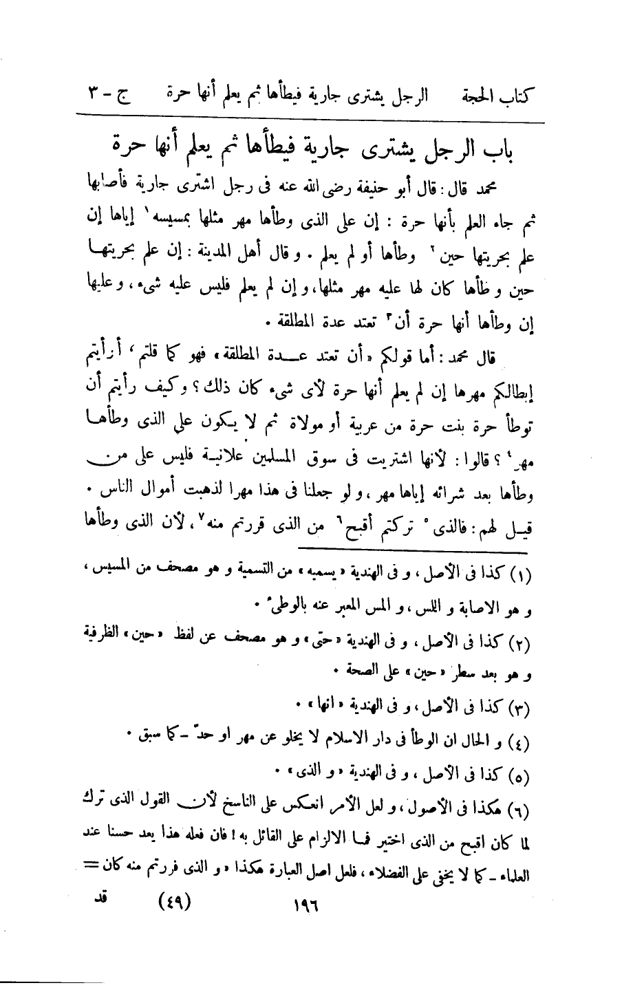 قَالَ مُحَمَّد اما قَوْلكُم ان تَعْتَد عدَّة الْمُطلقَة فَهُوَ كَمَا قُلْتُمْ أَرَأَيْتُم ابطالكم مهرهَا ان لم يعلم انها حرَّة لاي شَيْء كَانَ ذَلِك وَكَيف رايتم ان تُوطأ حرَّة بنت حرَّة من عَرَبِيَّة اَوْ مولاة ثمَّ لَا يكون على الَّذِي وَطأهَا مهر قَالُوا لانها اشْتريت فِي سوق الْمُسلمين عَلَانيَة فَلَيْسَ على من وَطأهَا بعد شِرَائِهِ اياها مهر وَلَو جعلنَا فِي هَذَا مهر لذهبت اموال النَّاس قيل لَهُم فَالَّذِي تركْتُم اقبح من الَّذِي قررتم مِنْهُ لَان الَّذِي وَطأهَا