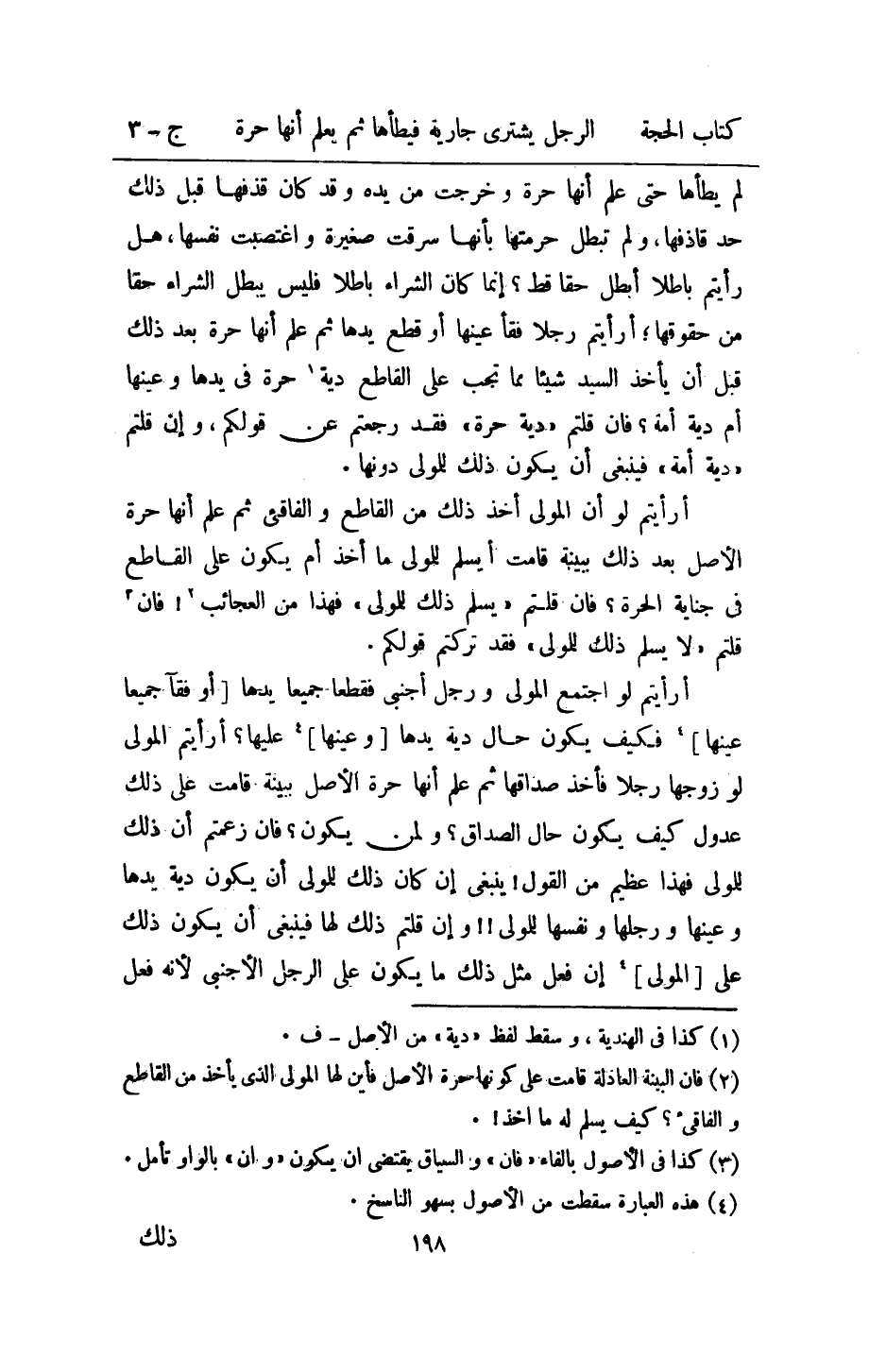 لم يَطَأهَا حَتَّى علم انها حرَّة وَخرجت من يَده وَقد كَانَ قَذفهَا قبل ذَلِك حد قاذفها وَلم تبطل حرمتهَا بانها سرقت صَغِيرَة واغتصبت نَفسهَا هَل رَأَيْتُمْ بَاطِلا ابطل حَقًا قطّ انما كَانَ الشِّرَاء بَاطِلا فَلَيْسَ يبطل الشِّرَاء حَقًا من حُقُوقهَا ارايتم رجلا فقا عينهَا اَوْ قطع يَدهَا ثمَّ علم انها حرَّة بعد ذَلِك قبل ان يَأْخُذ السَّيِّد شَيْئا مِمَّا تجب على الْقَاطِع دِيَة حرَّة فِي يَدهَا وعينها ام دِيَة امة فان قُلْتُمْ دِيَة حرَّة فقد رجعتم عَن قَوْلكُم وان قُلْتُمْ دِيَة امة فَيَنْبَغِي ان يكون ذَلِك للْمولى دونهَا