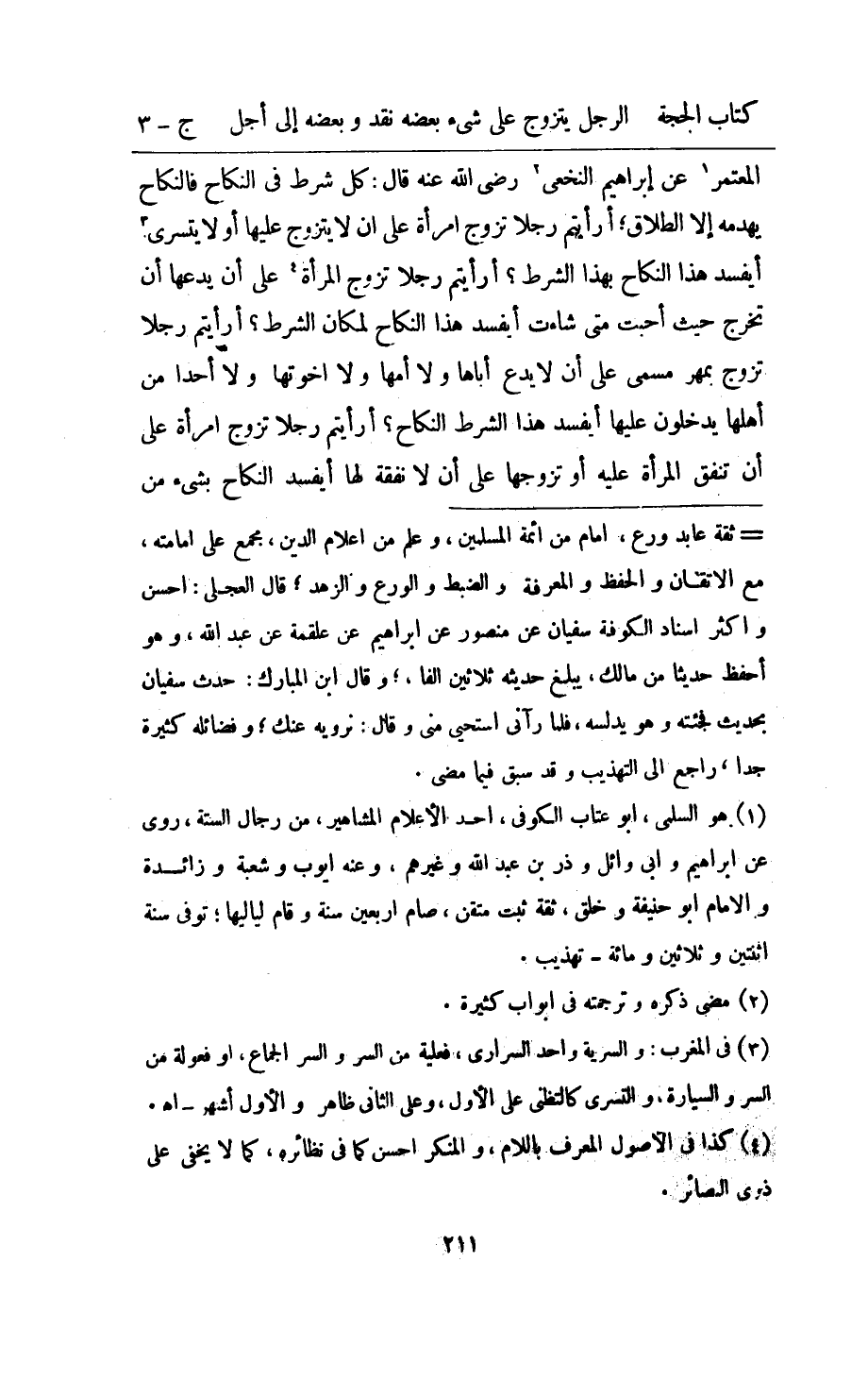 الْمُعْتَمِر عَن ابراهيم النَّخعِيّ رَضِي الله عَنهُ قَالَ كل شَرط فِي النِّكَاح فَالنِّكَاح يهدمه الا الطَّلَاق أَرَأَيْتُم رجلا تزوج امراة على ان لَا يتَزَوَّج عَلَيْهَا اَوْ لَا يتسرى ايفسد هَذَا النِّكَاح بِهَذَا الشَّرْط أَرَأَيْتُم رجلا تزوج الْمَرْأَة على ان يَدعهَا ان تخرج حَيْثُ احبت مَتى شَاءَت ايفسد هَذَا النِّكَاح لمَكَان الشَّرْط ارايتم رجلا تزوج بِمهْر مُسَمّى على ان لَا يدع اباها وَلَا امها وَلَا اخوتها والا احدا من اهلها يدْخلُونَ عَلَيْهَا ايفسد هَذَا الشَّرْط النِّكَاح أَرَأَيْتُم رجلا تزوج امراة على ان تنْفق الْمَرْأَة عَلَيْهِ اَوْ تزَوجهَا على ان لَا نَفَقَة لَهَا ايفسد النِّكَاح بِشَيْء من