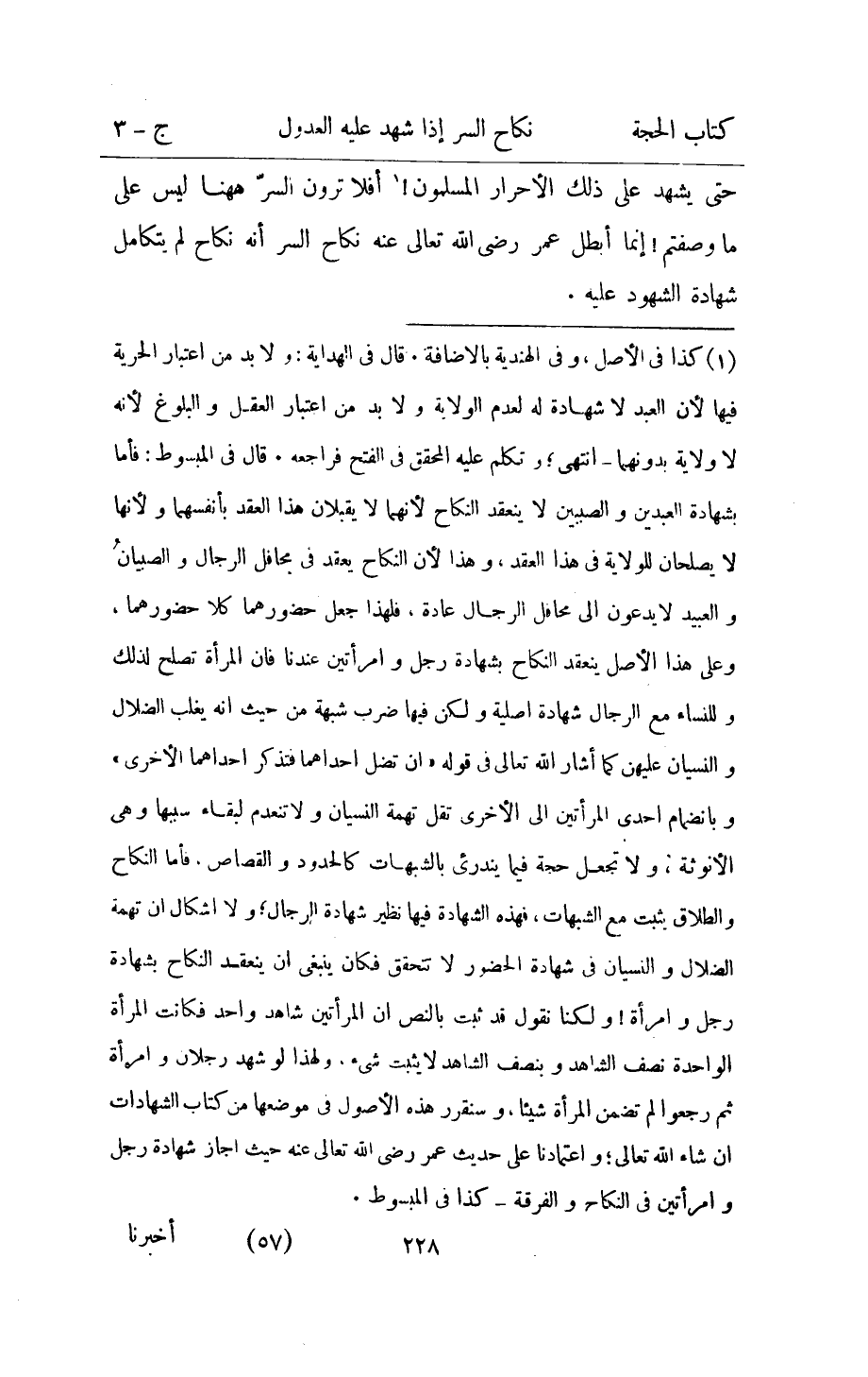 حَتَّى يشْهد على ذَلِك الاحرار الْمُسلمُونَ أَفلا ترَوْنَ السِّرّ هَهُنَا لَيْسَ على مَا وصفتم انما أبطل عمر رَضِي الله تَعَالَى عَنهُ نِكَاح السِّرّ انه نِكَاح لم يتكامل شَهَادَة الشُّهُود عَلَيْهِ