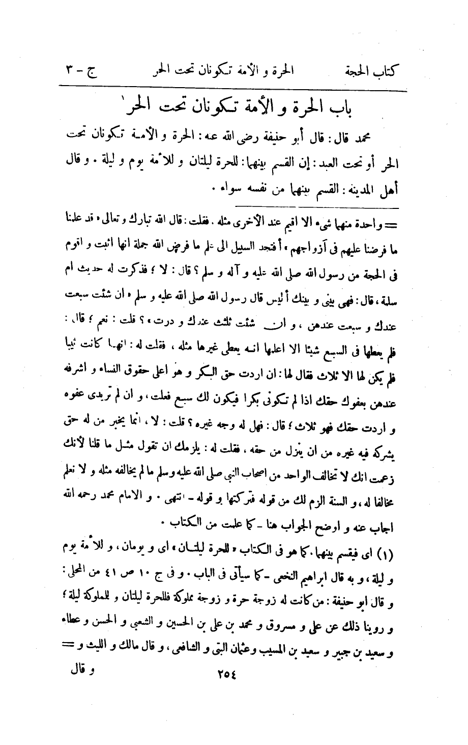 مُحَمَّد قَالَ قَالَ ابو حنيفَة رَضِي الله عَنهُ الْحرَّة والامة تَكُونَانِ تَحت الْحر اَوْ تَحت العَبْد ان الْقسم بَينهمَا للْحرَّة ليلتان وللامة يَوْم وَلَيْلَة وَقَالَ اهل الْمَدِينَة الْقسم بَينهمَا من نَفسه سَوَاء