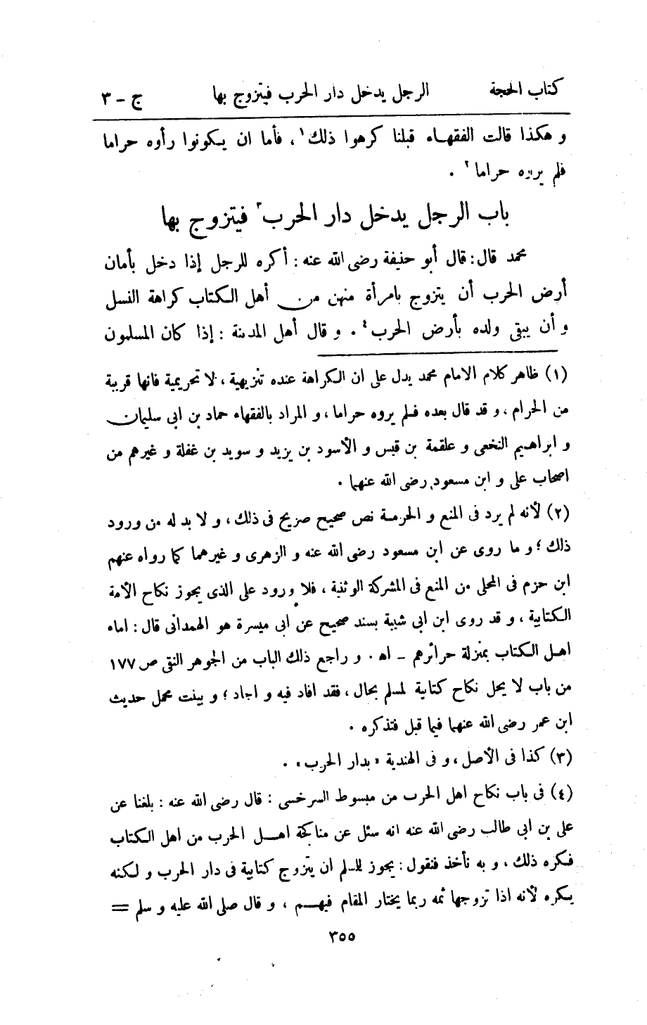 مُحَمَّد قَالَ قَالَ ابو حنيفَة رَضِي الله عَنهُ اكره للرجل اذا دخل بِأَمَان ارْض الْحَرْب ان يتَزَوَّج بِامْرَأَة مِنْهُنَّ من اهل الْكتاب كَرَاهَة النَّسْل وان يبْقى وَلَده بِأَرْض الْحَرْب وَقَالَ اهل الْمَدِينَة اذا كَانَ الْمُسلمُونَ