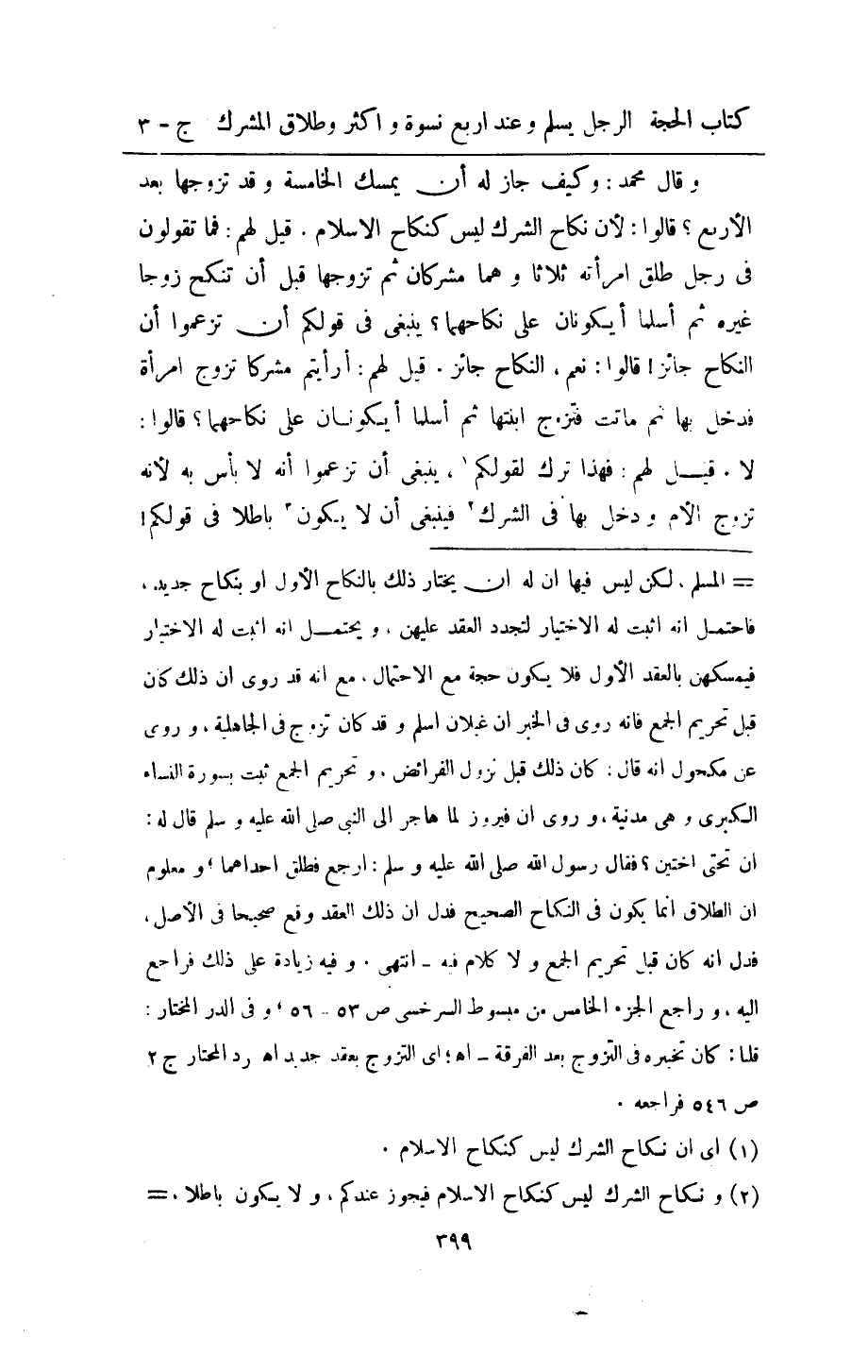 وَقَالَ مُحَمَّد وَكَيف جَازَ لَهُ ان يمسك الْخَامِسَة وَقد تزَوجهَا بعد الاربع قَالُوا لَان نِكَاح الشّرك لَيْسَ كَنِكَاح الاسلام قيل لَهُم فَمَا تَقولُونَ فِي رجل طلق امراته ثَلَاثًا وهما مُشْرِكَانِ ثمَّ تزَوجهَا قبل ان تنْكح زوجا غَيره ثمَّ اسلما ايكونان على نِكَاحهمَا يَنْبَغِي فِي قَوْلكُم ان تزعموا ان النِّكَاح جَائِز قَالُوا نعم النِّكَاح جَائِز قيل لَهُم ارايتم مُشْركًا تزوج امراة فَدخل بهَا ثمَّ مَاتَت فَتزَوج ابْنَتهَا ثمَّ اسلما ايكونان على نِكَاحهمَا قَالُوا لَا قيل لَهُم فَهَذَا ترك لقولكم يَنْبَغِي ان تزعموا انه لَا باس بِهِ لانه تزوج الام وَدخل بهَا فِي الشّرك فَيَنْبَغِي ان لَا يكون بَاطِلا فِي قَوْلكُم