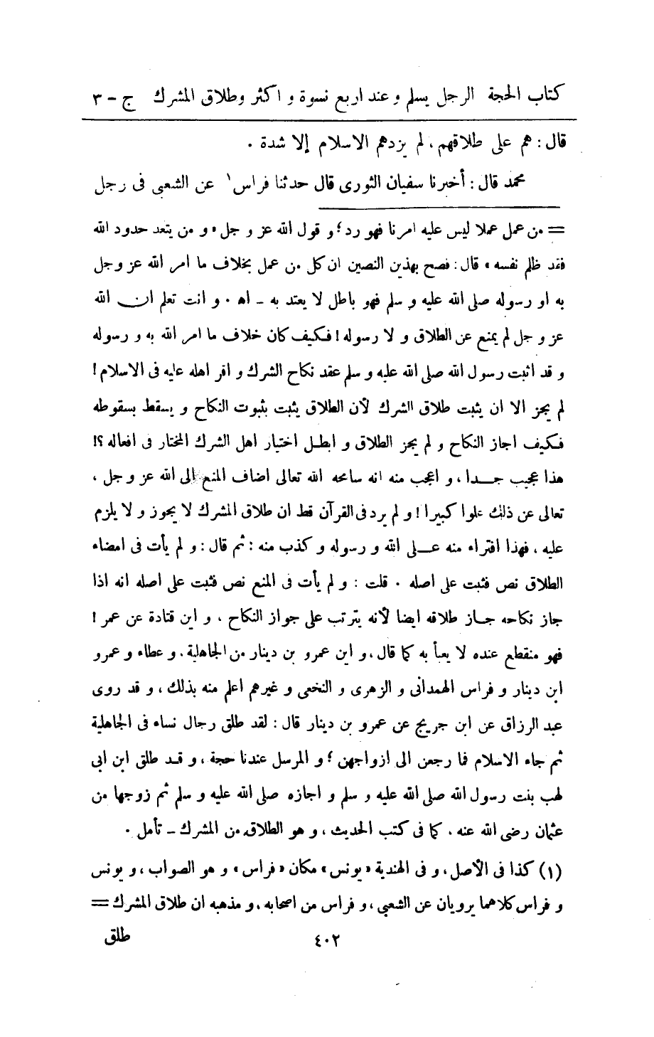 مُحَمَّد قَالَ اُخْبُرْنَا سُفْيَان الثَّوْريّ قَالَ حَدثنَا فراس عَن الشّعبِيّ فِي رجل