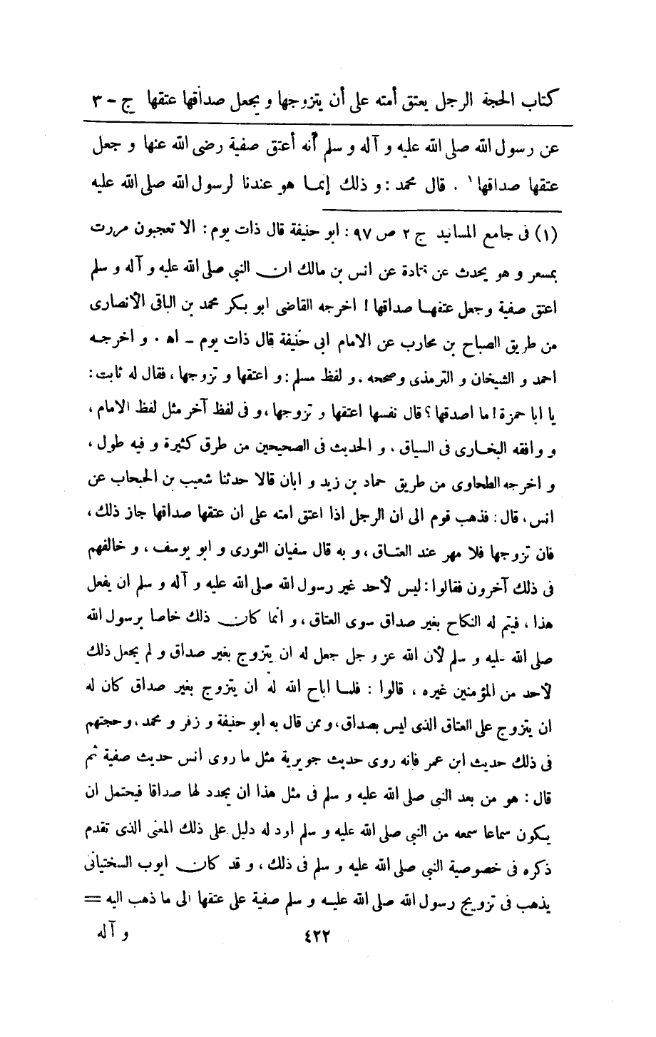 عَن رَسُول الله صلى الله عَلَيْهِ وَسلم انه اعْتِقْ صَفِيَّة رَضِي الله عَنْهَا وَجعل عتقهَا صَدَاقهَا قَالَ مُحَمَّد وَذَلِكَ انما هُوَ عندنَا لرَسُول الله صلى الله عَلَيْهِ