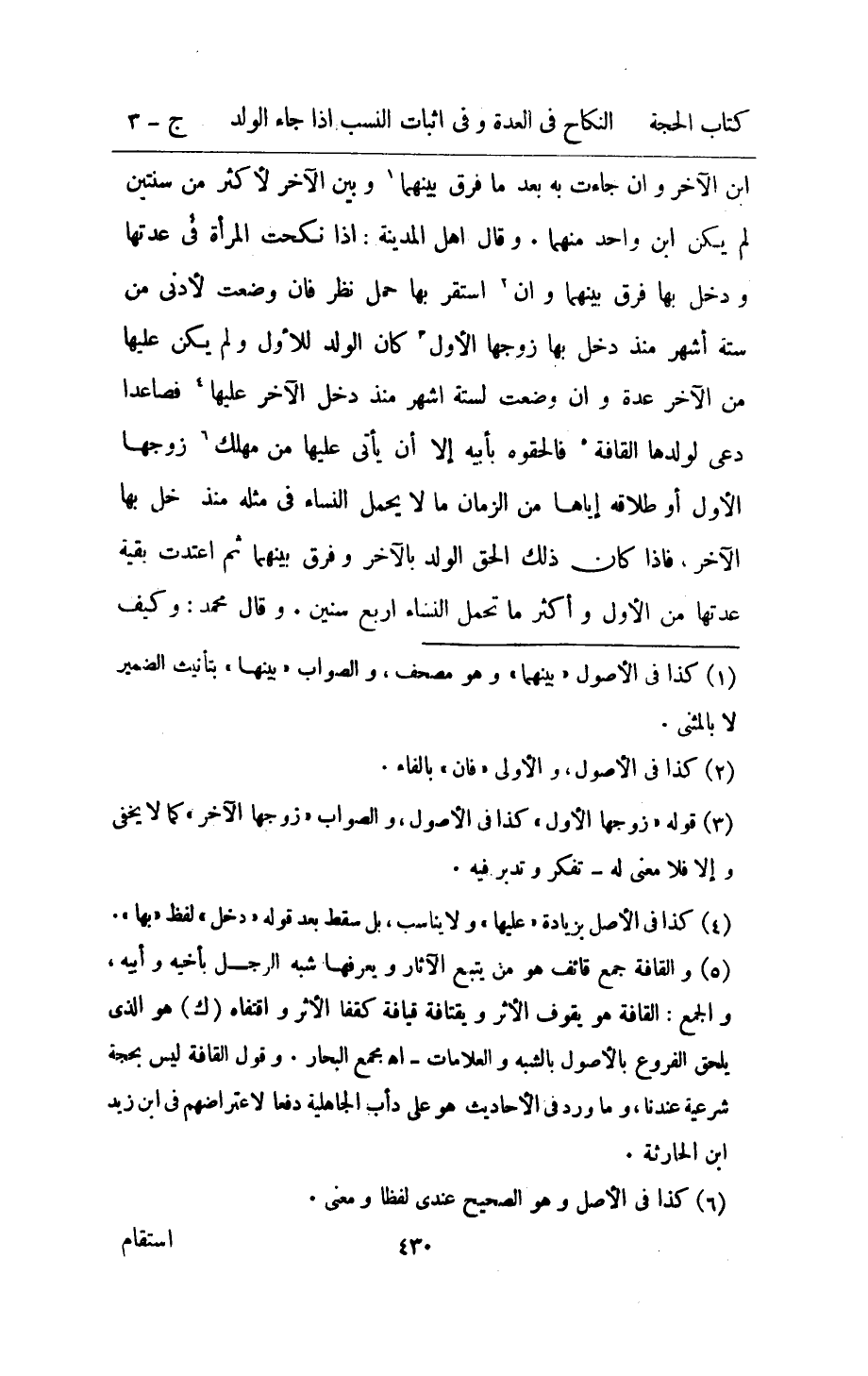 ابْن الاخر وان جَاءَت بِهِ بعد مَا فرق بَينهمَا وَبَين الآخر لاكثر من سنتَيْن لم يكن ابْن وَاحِد مِنْهُمَا وَقَالَ اهل الْمَدِينَة اذا نكحت الْمَرْأَة فِي عدتهَا وَدخل بهَا فرق بَينهمَا وان اسْتَقر بهَا حمل نظر فان وضعت لادنى من سِتَّة اشهر مُنْذُ دخل بهَا زَوجهَا الاول كَانَ الْوَلَد للْأولِ وَلم يكن عَلَيْهَا من الاخرة عدَّة وان وضعت لسِتَّة اشهر مُنْذُ دخل الاخر عَلَيْهَا فَصَاعِدا دعى لولدها الْقَافة فالحقوه بابيه الا أَن يأتى عَلَيْهَا من مهلك زَوجهَا الأول اَوْ طَلَاقه اياها من الزَّمَان مَالا يحمل النِّسَاء فِي مثله مُنْذُ دخل بهَا الآخر فاذا كَانَ ذَلِك الْحق الْوَلَد بِالْآخرِ وَفرق بَينهمَا ثمَّ اعْتدت بَقِيَّة عدتهَا من الاول واكثر مَا تحمل النِّسَاء ارْبَعْ سِنِين وَقَالَ مُحَمَّد وَكَيف