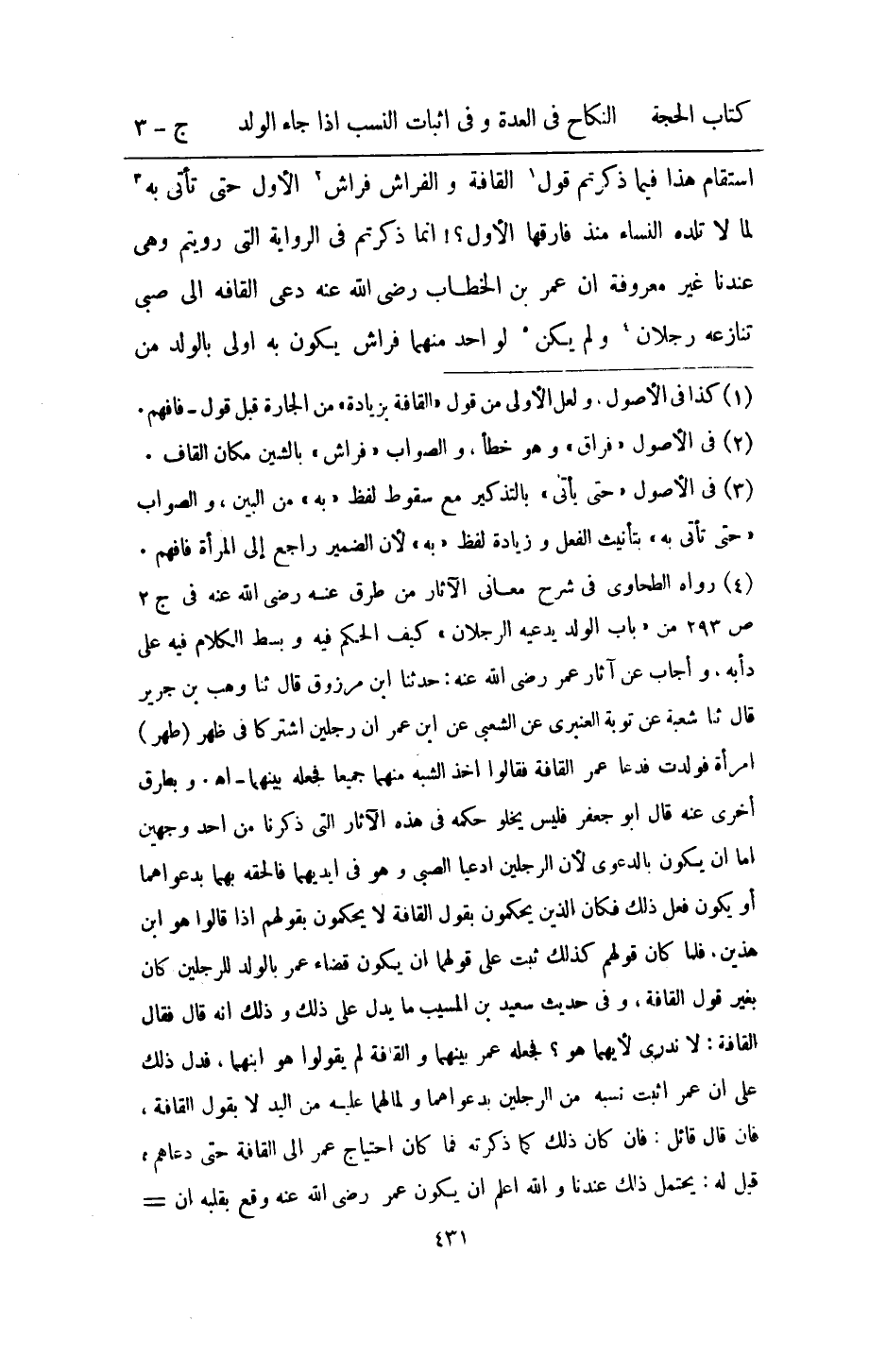 استقام هَذَا فِيمَا ذكرْتُمْ قَول الْقَافة والفراش فرَاش الأول حَتَّى تأتى بِهِ لما لَا تلده النِّسَاء مُنْذُ فَارقهَا الاول انما ذكرْتُمْ فِي الرِّوَايَة الَّتِي رويتم وَهِي عندنَا غير مَعْرُوفَة ان عمر بن الْخطاب رَضِي الله عَنهُ دعى القافه إِلَى صبى تنازعه رجلَانِ وَلم يكن لوَاحِد مِنْهُمَا فرَاش يكون بِهِ اولى بِالْوَلَدِ من