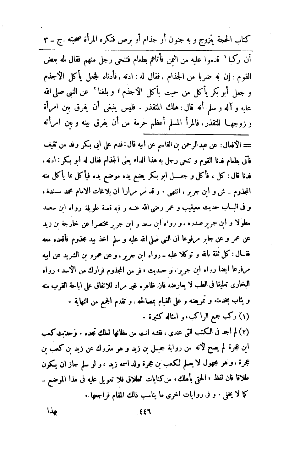 ان ركبا قدمُوا عَلَيْهِ من الْيمن فاتاهم بِطَعَام فَتنحّى رجل مِنْهُم فَقَالَ لَهُ بعض الْقَوْم ان بِهِ ضربا من الجذام فَقَالَ لَهُ ادنه فادناه فَجعل ياكل الاجذم وَجعل ابو بكر ياكل من حيت ياكل الاجذم وبلغنا عَن النَّبِي صلى الله عَلَيْهِ وَسلم انه قَالَ هلك المتقذر فَلَيْسَ يَنْبَغِي ان يفرق بَين امراة وَزوجهَا للتقذر فالمرا الْمُسلم اعظم حُرْمَة من ان يفرق بَينه وَبَين امراته