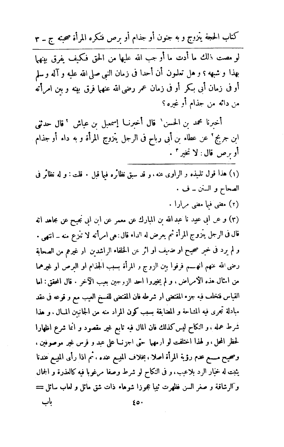 اُخْبُرْنَا مُحَمَّد بن الْحسن قَالَ اُخْبُرْنَا اسمعيل بن عَيَّاش قَالَ حَدثنِي ابْن جريج عَن عَطاء بن ابي رَبَاح فِي الرجل يتَزَوَّج المراه وَبِه دَاء اَوْ جذام اَوْ برص قَالَ لَا تخير