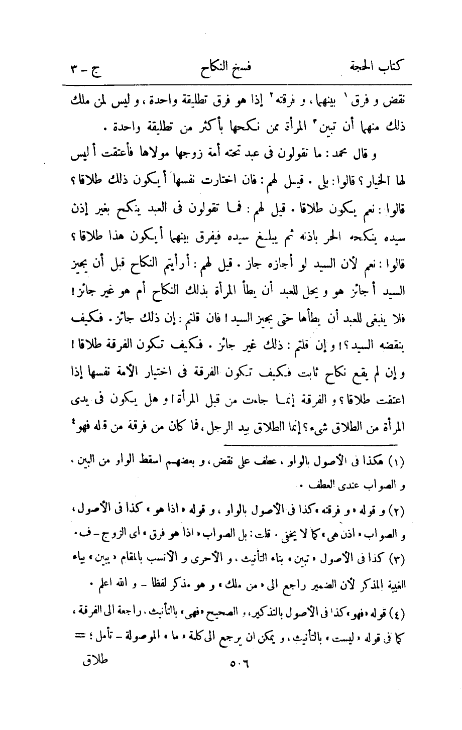 وَقَالَ مُحَمَّد مَا تَقولُونَ فِي عبد تَحْتَهُ امة زَوجهَا مَوْلَاهَا فاعتقت الْيَسْ لَهَا الْخِيَار قَالُوا بلَى قيل لَهُم فان اخْتَارَتْ نَفسهَا ايكون ذَلِك طَلَاقا قَالُوا نعم يكون طَلَاقا قيل لَهُم فَمَا تَقولُونَ فِي العَبْد ينْكح بِغَيْر اذن سَيّده ينكحه الْحر باذنه ثمَّ يبلغ سَيّده فَيُفَرق بَينهمَا ايكون هَذَا طَلَاقا قَالُوا نعم لَان السَّيِّد لَو اجازه جَازَ قيل لَهُم ارايتم النِّكَاح قبل ان يُجِيز السَّيِّد اجائز هُوَ وَيحل للْعَبد ان يطَأ الْمَرْأَة بذلك النِّكَاح ام هُوَ غير جَائِز فَلَا يَنْبَغِي للْعَبد ان يَطَأهَا حَتَّى يُجِيز السَّيِّد فان قُلْتُمْ ان ذَلِك جَائِز فَكيف ينْقضه السَّيِّد وان قُلْتُمْ غير جَائِز فَكيف تكون الْفرْقَة طَلَاقا وان لم يَقع نِكَاح ثَابت فَكيف تكون الْفرْقَة فِي اخْتِيَار الامة نَفسهَا اذا اعتقت طَلَاقا والفرقة انما جَاءَت من قبل الْمَرْأَة وَهل يكون فِي يَدي الْمَرْأَة من الطَّلَاق شَيْء انما الطَّلَاق بيد الرجل فَمَا كَانَ من فرقة من قبله فَهُوَ