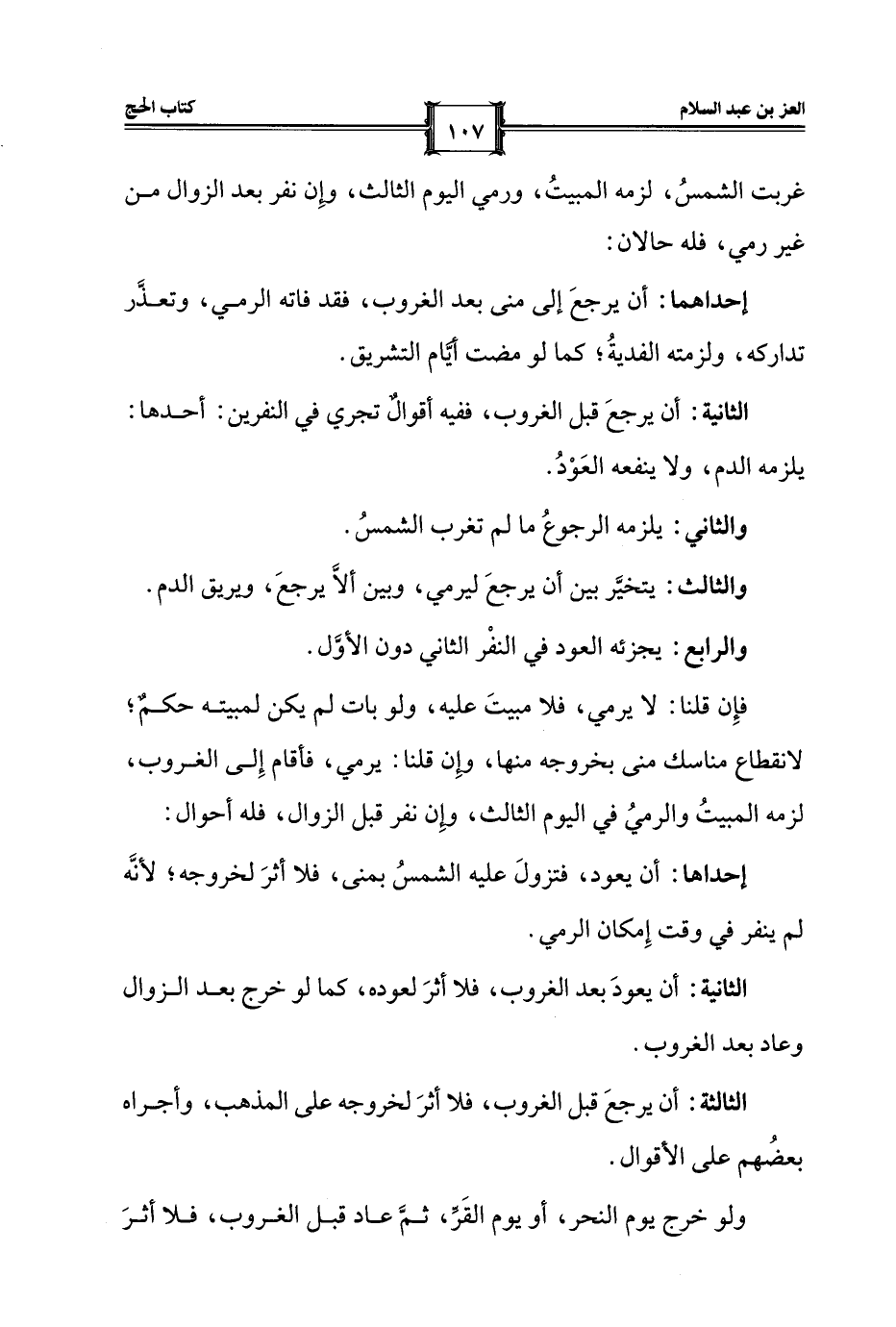 فإِن قلنا: لا يرمي، فلا مبيتَ عليه، ولو بات لم يكن لمبيته حكمٌ؛ لانقطاع مناسك منى بخروجه منها، وإِن قلنا: يرمي، فأقام إِلى الغروب، لزمه المبيتُ والرميُ في اليوم الثالث، وإِن نفر قبل الزوال، فله أحوال: إحداهما: أن يعود، فتزولَ عليه الشمسُ بمنى، فلا أثرَ لخروجه؛ لأنَّه لم ينفر في وقت إِمكان الرمي.