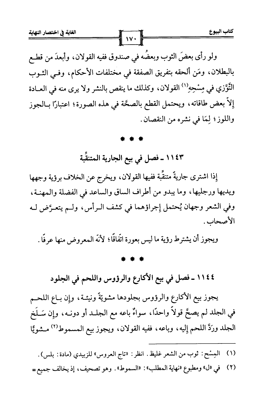 1144 - فصل في بيع الأكارع والرؤوس واللحم في الجلود