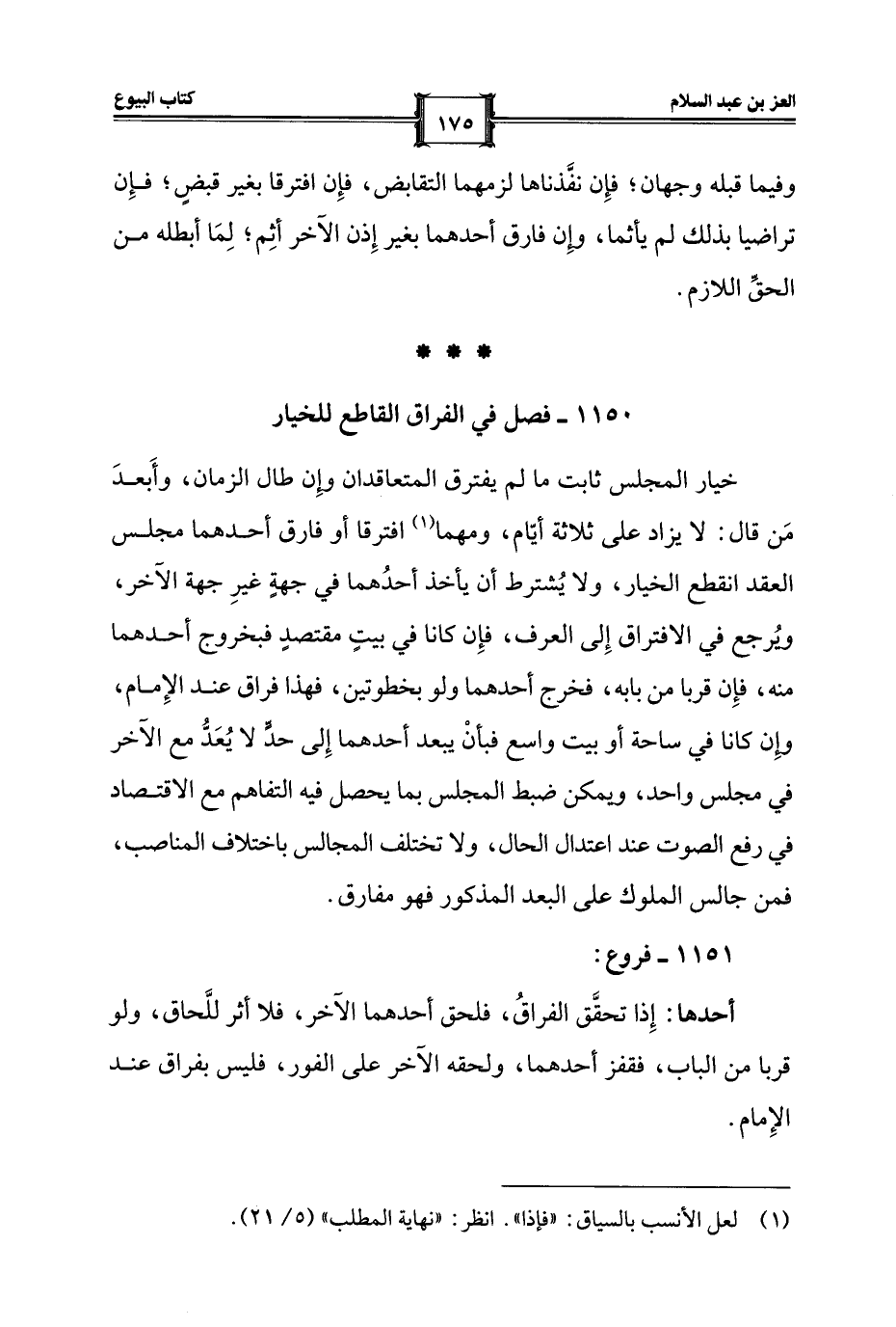 خيار المجلس ثابت ما لم يفترق المتعاقدان وإِن طال الزمان، وأَبعدَ مَن قال: لا يزاد على ثلاثة أيّام، ومهما (¬1) افترقا أو فارق أحدهما مجلس العقد انقطع الخيار، ولا يُشترط أن يأخذ أحدُهما في جهةٍ غيرِ جهة الآخر، ويُرجع في الافتراق إِلى العرف، فإِن كانا في بيتٍ مقتصدٍ فبخروج أحدهما منه، فإِن قربا من بابه، فخرج أحدهما ولو بخطوتين، فهذا فراق عند الإِمام، وإِن كانا في ساحة أو بيت واسع فبأنْ يبعد أحدهما إِلى حدٍّ لا يُعَدُّ مع الآخر في مجلس واحد، ويمكن ضبط المجلس بما يحصل فيه التفاهم مع الاقتصاد في رفع الصوت عند اعتدال الحال، ولا تختلف المجالس باختلاف المناصب، فمن جالس الملوك على البعد المذكور فهو مفارق.