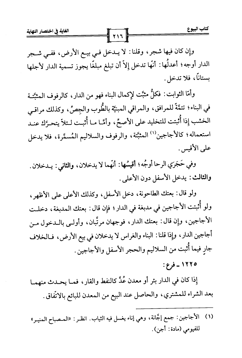 ولو قال: بعتك الطاحونة، دخل الأسفل، وكذلك الأعلى على الأظهر، ولو أُثبتت الأجاجين في مدبغة في الدار؛ فإِن قال: بعتك المدبغة، دخلت الأجاجين، وإِن قال: بعتك الدار، فوجهان مرتَّبان، وأولى بالدخول من أجاجين الدار، وإِذا قلنا: البناء والغراس لا يدخلان في بيع الأرض، فالخلاف جارٍ فيما أُثبت من السلاليم والحجر الأسفل والأجاجين.