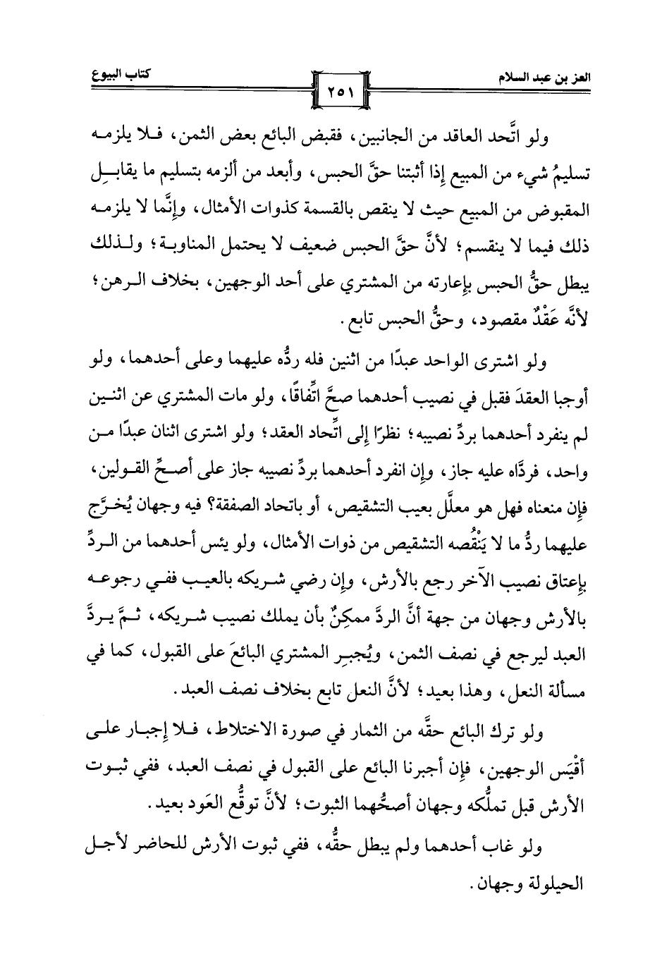 ولو اتَّحد العاقد من الجانبين، فقبض البائع بعض الثمن، فلا يلزمه تسليمُ شيء من المبيع إِذا أثبتنا حقَّ الحبس، وأبعد من ألزمه بتسليم ما يقابِل المقبوض من المبيع حيث لا ينقص بالقسمة كذوات الأمثال، وإِنَّما لا يلزمه ذلك فيما لا ينقسم؛ لأنَّ حقَّ الحبس ضعيف لا يحتمل المناوبة؛ ولذلك يبطل حقُّ الحبس بإِعارته من المشتري على أحد الوجهين، بخلاف الرهن؛ لأنَّه عَقْدٌ مقصود، وحقُّ الحبس تابع.