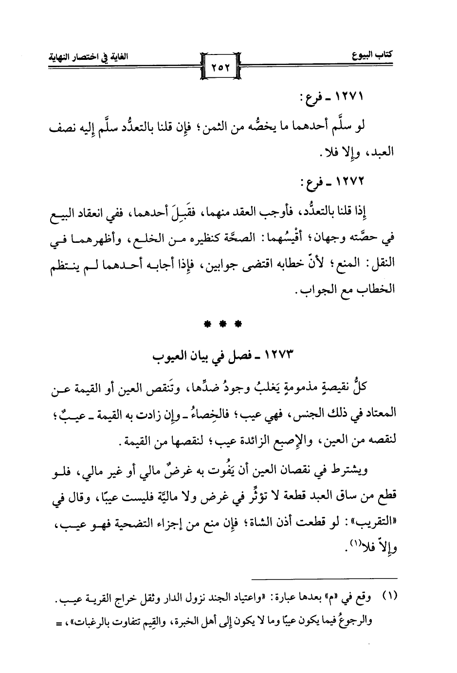 (¬1) وقع في "م" بعدها عبارة: "واعتياد الجند نزول الدار وثقل خراج القرية عيب. والرجوعُ فيما يكون عيبًا وما لا يكون إِلى أهل الخبرة، والقِيم تتفاوت بالرغبات"، =