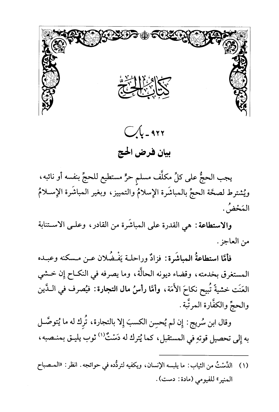 فأمَّا استطاعةُ المباشَرة: فزادٌ وراحلة يَفْضُلان عن مسكنه وعبده المستغرق بخدمته، وقضاء ديونه الحالَّة، وما يصرفه في النكاح إِن خشي العَنَت خشية تُبيح نكاحَ الأَمَة، وأمَّا رأسُ مال التجارة: فيُصرف في الدَّين والحجِّ والكفَّارة المرتَّبة.