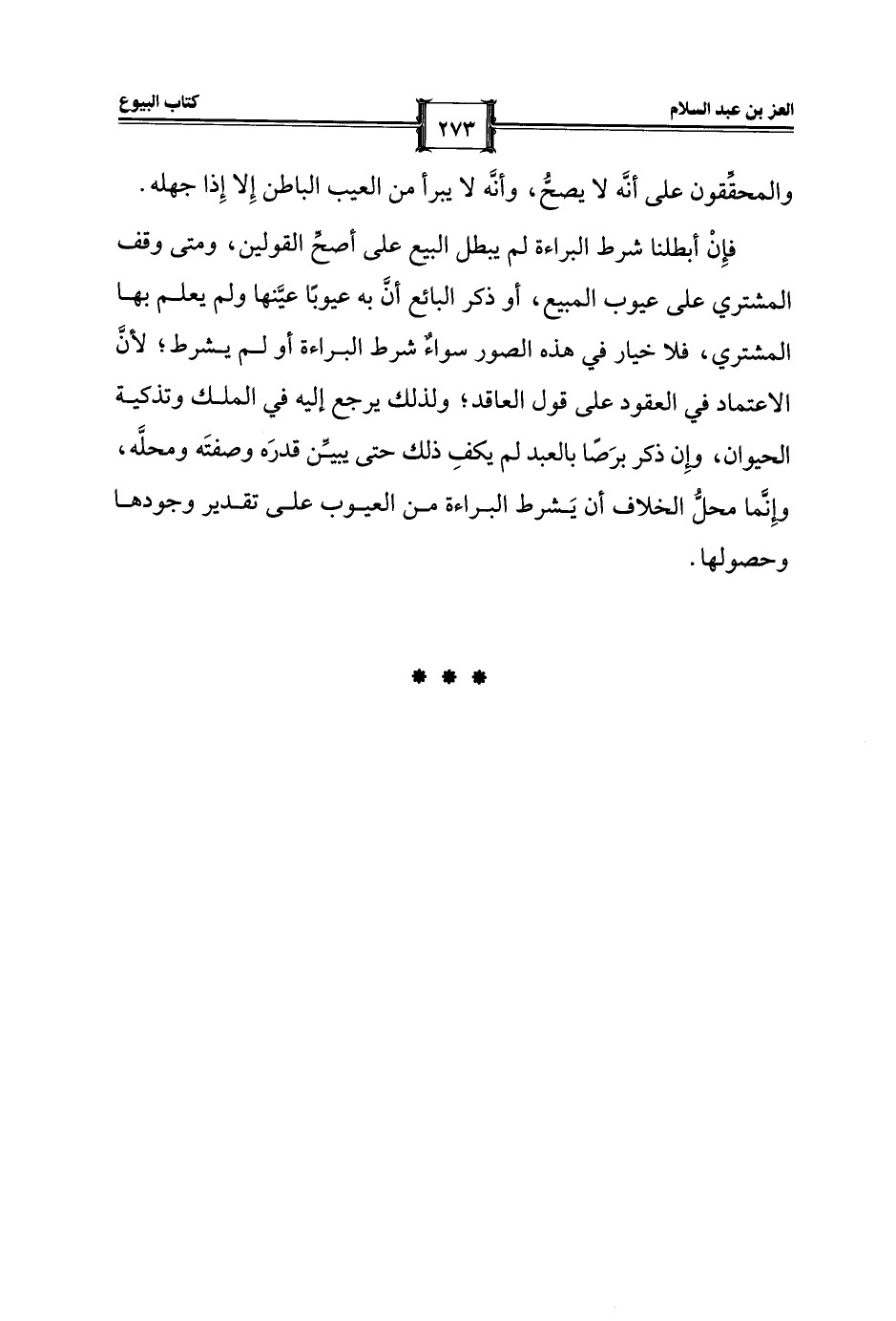 فإِنْ أبطلنا شرط البراءة لم يبطل البيع على أصحِّ القولين، ومتى وقف المشتري على عيوب المبيع، أو ذكر البائع أنَّ به عيوبًا عيَّنها ولم يعلم بها المشتري، فلا خيار في هذه الصور سواءٌ شرط البراءة أو لم يشرط؛ لأنَّ الاعتماد في العقود على قول العاقد؛ ولذلك يرجع إليه في الملك وتذكية الحيوان، وإِن ذكر برَصًا بالعبد لم يكفِ ذلك حتى يبيِّن قدرَه وصفتَه ومحلَّه، وإِنَّما محلُّ الخلاف أن يَشرط البراءة من العيوب على تقدير وجودها وحصولها.