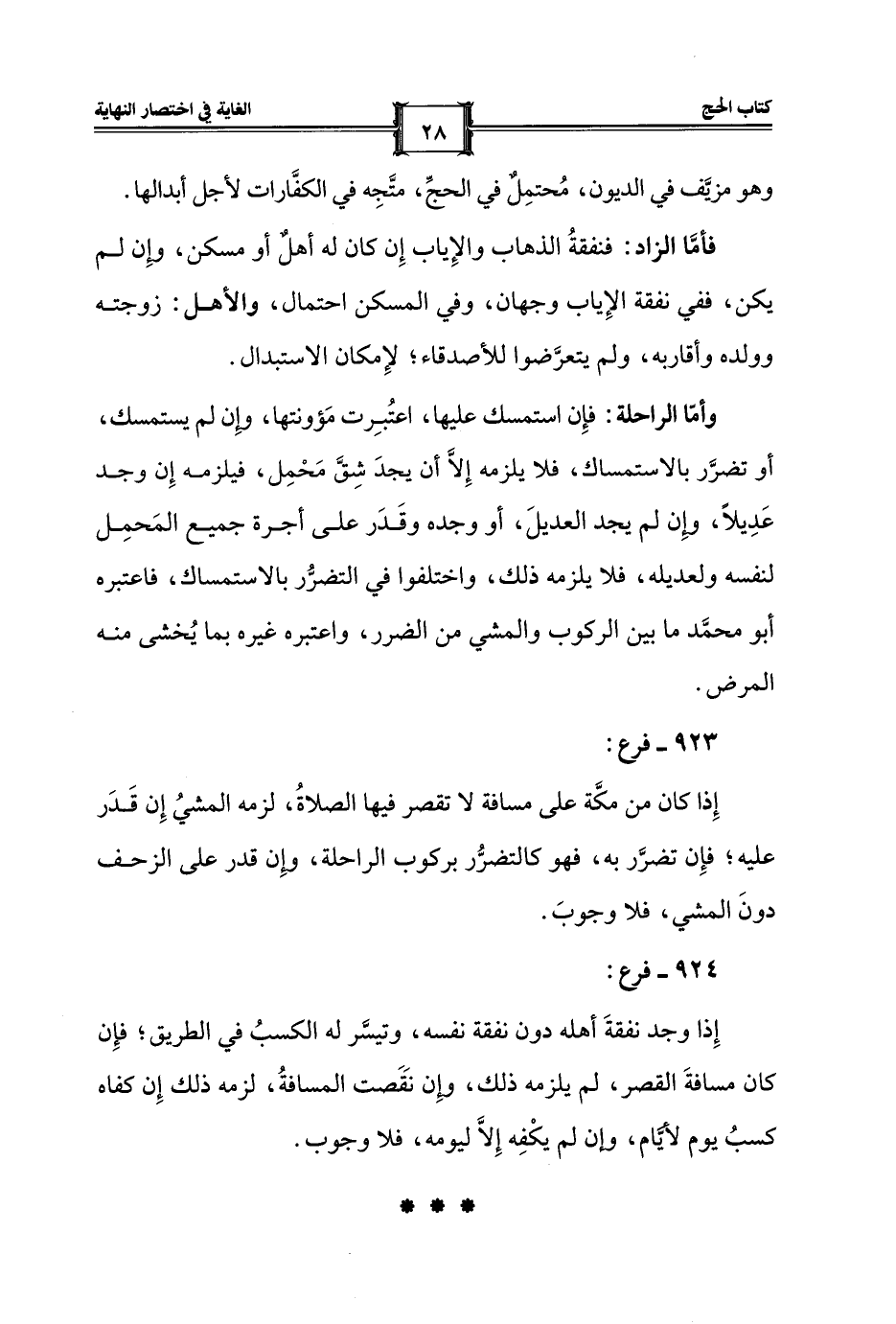 إِذا وجد نفقةَ أهله دون نفقة نفسه، وتيسَّر له الكسبُ في الطريق؛ فإِن كان مسافةَ القصر، لم يلزمه ذلك، وإِن نَقَصت المسافةُ، لزمه ذلك إِن كفاه كسبُ يوم لأيَّام، وإن لم يكْفِه إِلَّا ليومه، فلا وجوب.