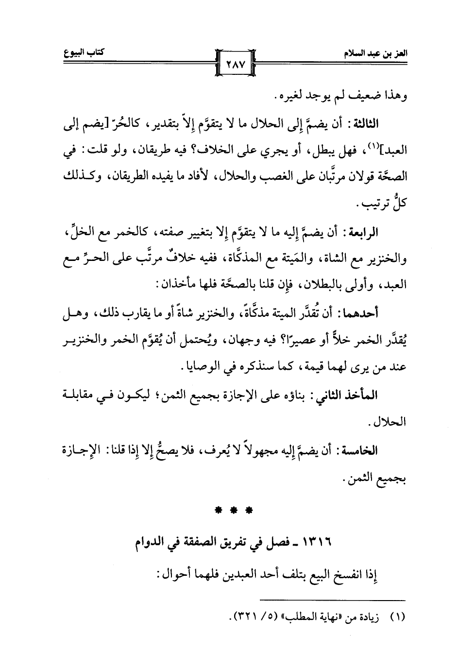 الثالثة: أن يضمَّ إِلى الحلال ما لا يتقوَّم إِلّا بتقدير، كالحُرّ [يضم إلى العبد] (¬1)، فهل يبطل، أو يجري على الخلاف؟ فيه طريقان، ولو قلت: في الصحَّة قولان مرتَّبان على الغصب والحلال، لأفاد ما يفيده الطريقان، وكذلك كلُّ ترتيب.