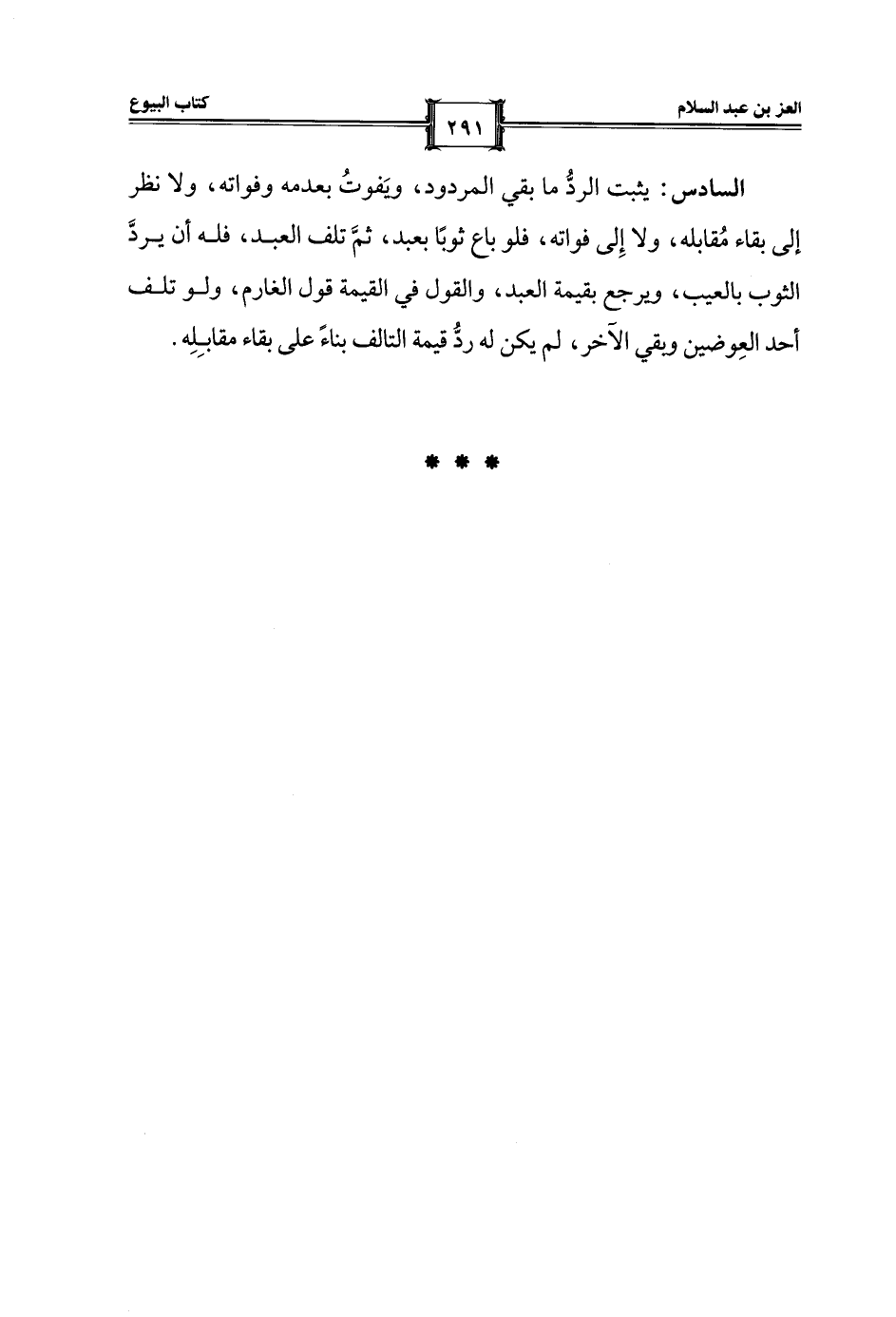 السادس: يثبت الردُّ ما بقي المردود، ويَفوتُ بعدمه وفواته، ولا نظر إلى بقاء مُقابله، ولا إِلى فواته، فلو باع ثوبًا بعبد، ثمَّ تلف العبد، فله أن يردَّ الثوب بالعيب، ويرجع بقيمة العبد، والقول في القيمة قول الغارم، ولو تلف أحد العِوضين وبقي الآخر، لم يكن له ردُّ قيمة التالف بناءً على بقاء مقابِلِه.