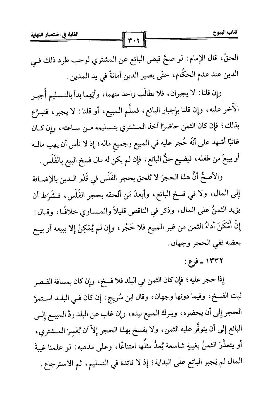 إِذا حجر عليه؛ فإِن كان الثمن في البلد فلا فسخ، وإِن كان بمسافة القصر ثبت الفسخ، وفيما دونها وجهان، وقال ابن سُريج: إِن كان في البلد استمرَّ الحجر إِلى أن يحضره، ويترك المبيع بيده، وإِن غاب عن البلد ردَّ المبيع إِلى الباع إِلى أن يتوفَّر عليه الثمن، ولا يفسخ بهذا الحجر إِلّا أن يُعْسِرَ المشتري، أو يتعذَّرَ الثمنُ بغيبةٍ شاسعة يُعدُّ مثلُها امتناعًا، وعلى مذهبه: لو علمنا غيبةَ المال لم يُجبر الباع على البداية؛ إِذ لا فائدة في التسليم، ثم الاسترجاع.