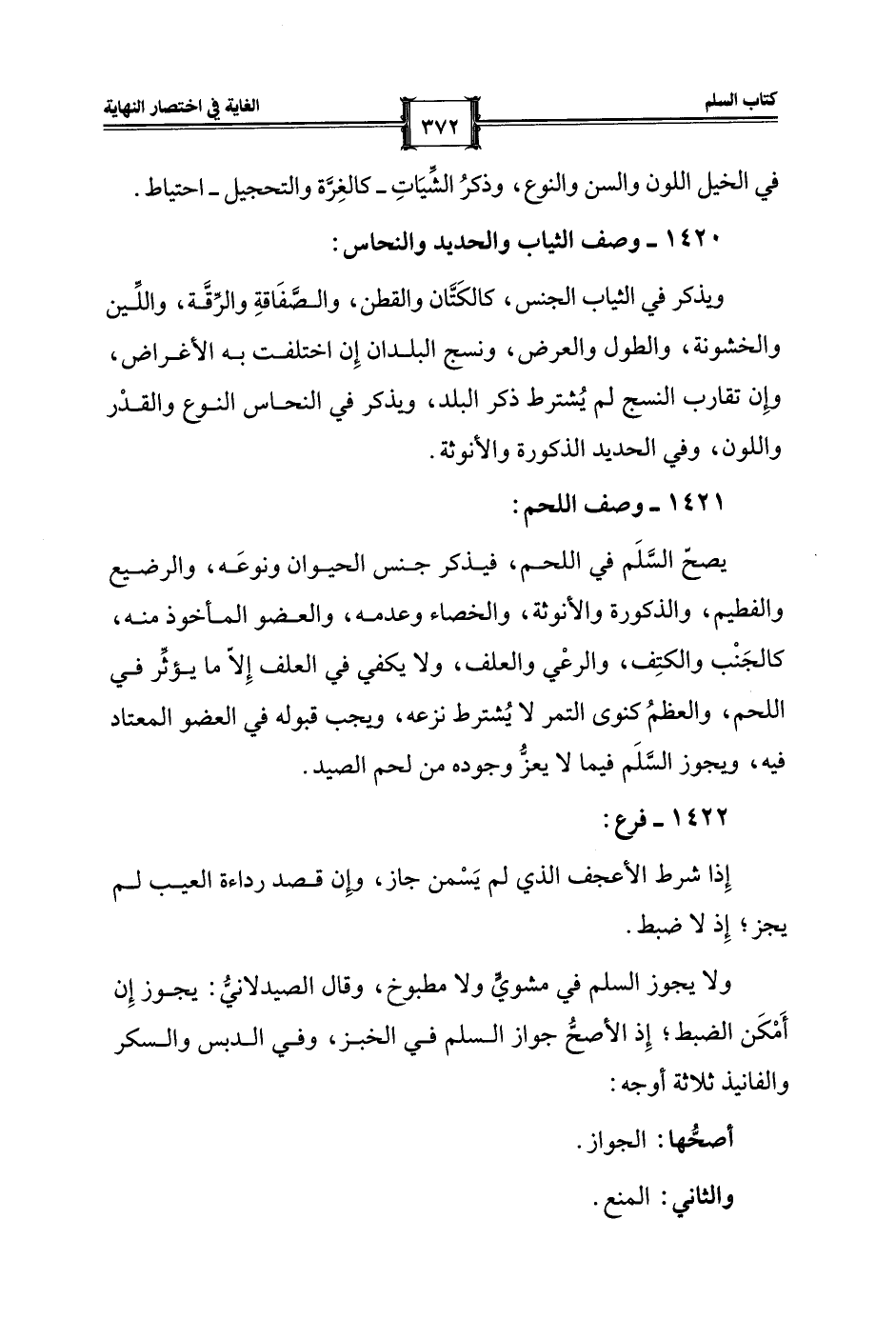 يصحّ السَّلَم في اللحم، فيذكر جنس الحيوان ونوعَه، والرضيع والفطيم، والذكورة والأنوثة، والخصاء وعدمه، والعضو المأخوذ منه، كالجَنْب والكتِف، والرعْي والعلف، ولا يكفي في العلف إِلّا ما يؤثِّر في اللحم، والعظمُ كنوى التمر لا يُشترط نزعه، ويجب قبوله في العضو المعتاد فيه، ويجوز السَّلَم فيما لا يعزُّ وجوده من لحم الصيد.
