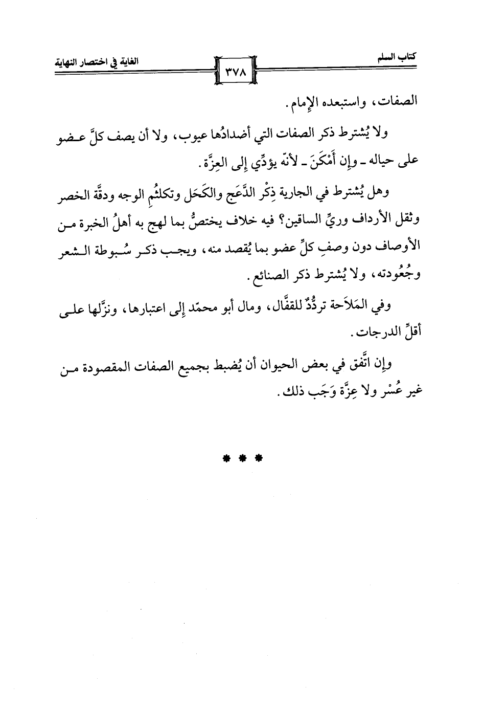 وهل يُشترط في الجارية ذِكْر الدَّعَج والكَحَل وتكلثُمِ الوجه ودقَّة الخصر وثقل الأرداف وريِّ الساقين؟ فيه خلاف يختصُّ بما لهج به أهلُ الخبرة من الأوصاف دون وصفِ كلِّ عضو بما يُقصد منه، ويجب ذكر سُبوطة الشعر وجُعُودته، ولا يُشترط ذكر الصنائع.