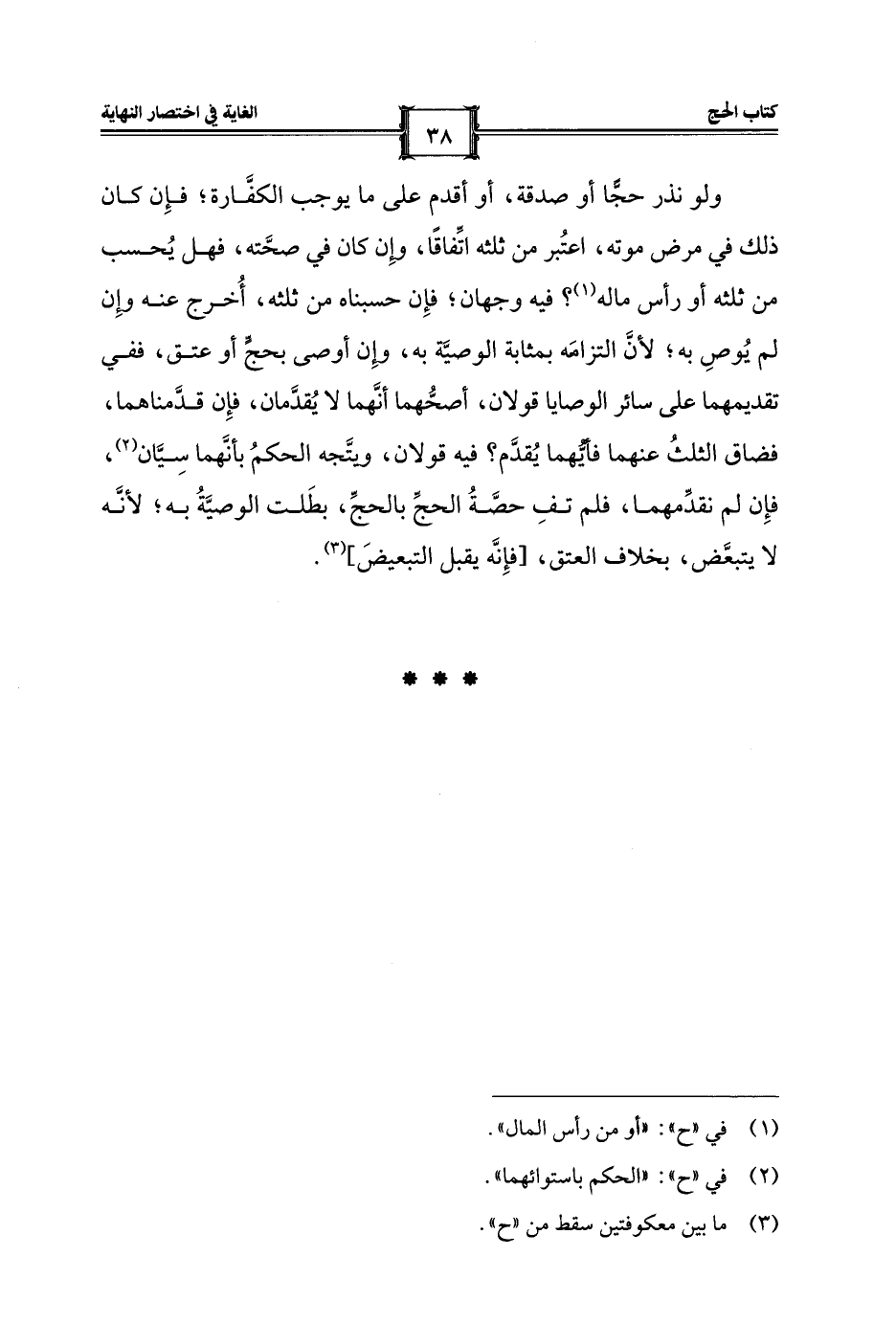 ولو نذر حجًّا أو صدقة، أو أقدم على ما يوجب الكفَّارة؛ فإِن كان ذلك في مرض موته، اعتُبر من ثلثه اتِّفاقًا، وإِن كان في صحَّته، فهل يُحسب من ثلثه أو رأس ماله (¬1)؛ فيه وجهان؛ فإِن حسبناه من ثلثه، أُخرج عنه وإِن لم يُوصِ به؛ لأنَّ التزامَه بمثابة الوصيَّة به، وإِن أوصى بحجٍّ أو عتق، ففي تقديمهما على سائر الوصايا قولان، أصحُّهما أنَّهما لا يُقدَّمان، فإِن قدَّمناهما، فضاق الثلثُ عنهما فأيُّهما يُقدَّم؟ فيه قولان، ويتَّجه الحكمُ بأنَّهما سِيَّان (¬2)، فإِن لم نقدِّمهما، فلم تفِ حصَّةُ الحجِّ بالحجِّ، بطَلت الوصيَّةُ به؛ لأنَّه لا يتبعَّض، بخلاف العتق، [فإِنَّه يقبل التبعيضَ] (¬3).