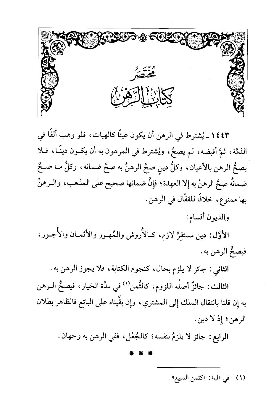 1443 - يُشترط في الرهن أن يكون عينًا كالهبات، فلو وهب ألفًا في الذمَّة، ثمَّ أقبضه، لم يصحَّ، ويُشترط في المرهون به أن يكون دينًا، فلا يصحُّ الرهن بالأعيان، وكلُّ دينٍ صحَّ الرهنُ به صحَّ ضمانه، وكلُّ ما صحَّ ضمانُه صحَّ الرهنُ به إِلا العهدة؛ فإِنَّ ضمانها صحيح على المذهب، والرهنُ بها ممنوع، خلافًا للقفّال في الرهن.