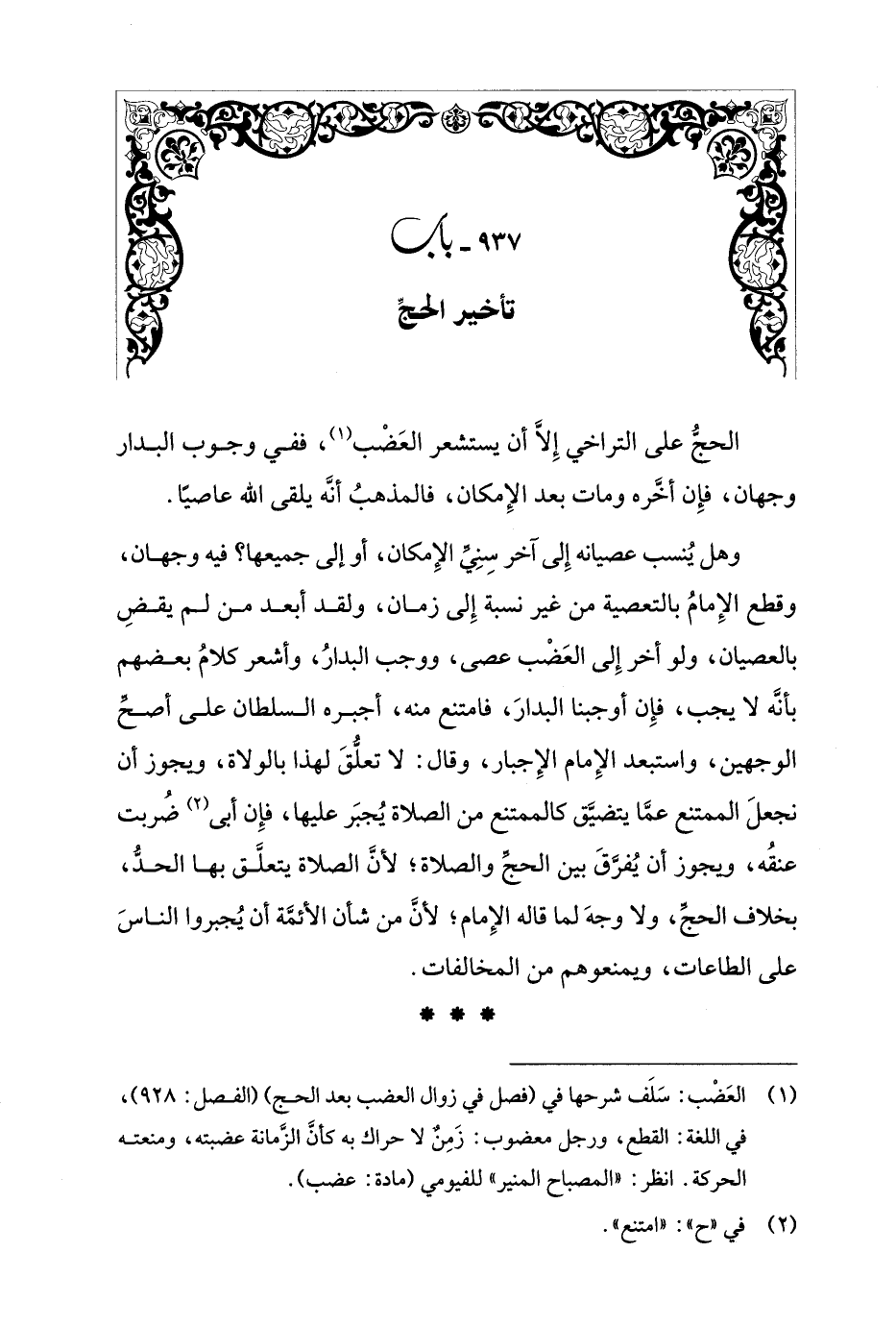 وهل يُنسب عصيانه إِلى آخر سِنِيِّ الإِمكان، أو إلى جميعها؟ فيه وجهان، وقطع الإِمامُ بالتعصية من غير نسبة إِلى زمان، ولقد أبعد من لم يقضِ بالعصيان، ولو أخر إِلى العَضْب عصى، ووجب البدارُ، وأشعر كلامُ بعضهم بأنَّه لا يجب، فإِن أوجبنا البدارَ، فامتنع منه، أجبره السلطان على أصحِّ الوجهين، واستبعد الإِمام الإِجبار، وقال: لا تعلُّقَ لهذا بالولاة، ويجوز أن نجعلَ الممتنع عمَّا يتضيَّق كالممتنع من الصلاة يُجبَر عليها، فإِن أبى (¬2) ضُربت عنقُه، ويجوز أن يُفرَّقَ بين الحجِّ والصلاة؛ لأنَّ الصلاة يتعلَّق بها الحدُّ، بخلاف الحجِّ، ولا وجهَ لما قاله الإِمام؛ لأنَّ من شأن الأئمَّة أن يُجبروا الناسَ على الطاعات، ويمنعوهم من المخالفات.