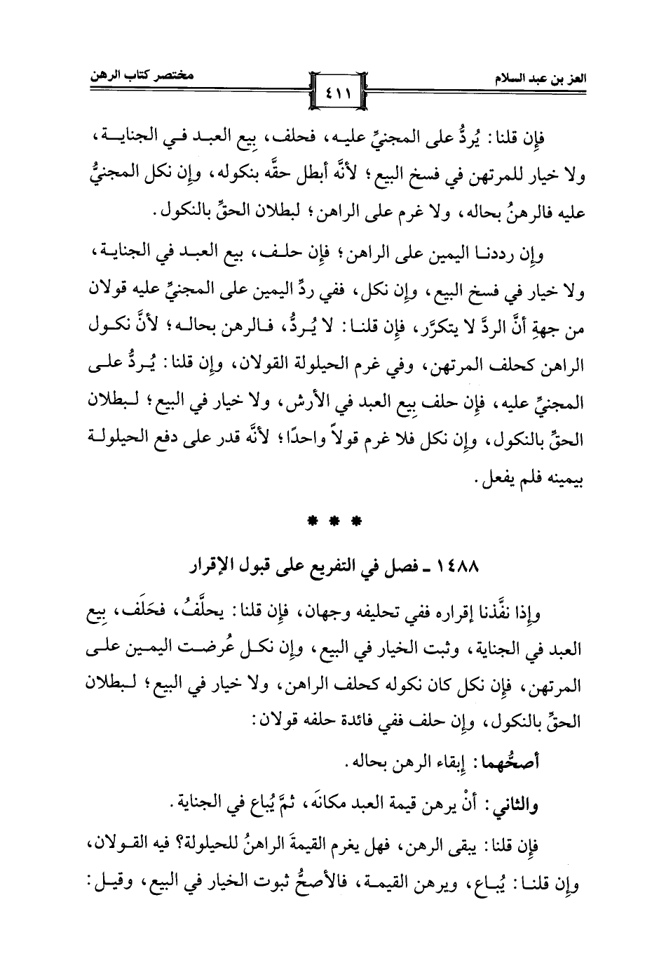 وإِن رددنا اليمين على الراهن؛ فإِن حلف، بيع العبد في الجناية، ولا خيار في فسخ البيع، وإِن نكل، ففي ردِّ اليمين على المجنيِّ عليه قولان من جهةِ أنَّ الردَّ لا يتكرَّر، فإِن قلنا: لا يُردُّ، فالرهن بحاله؛ لأنَّ نكول الراهن كحلف المرتهن، وفي غرم الحيلولة القولان، وإِن قلنا: يُردُّ على المجنيِّ عليه، فإِن حلف بِيع العبد في الأرش، ولا خيار في البيع؛ لبطلان الحق بالنكول، وإِن نكل فلا غرم قولًا واحدًا؛ لأنَّه قدر على دفع الحيلولة بيمينه فلم يفعل.