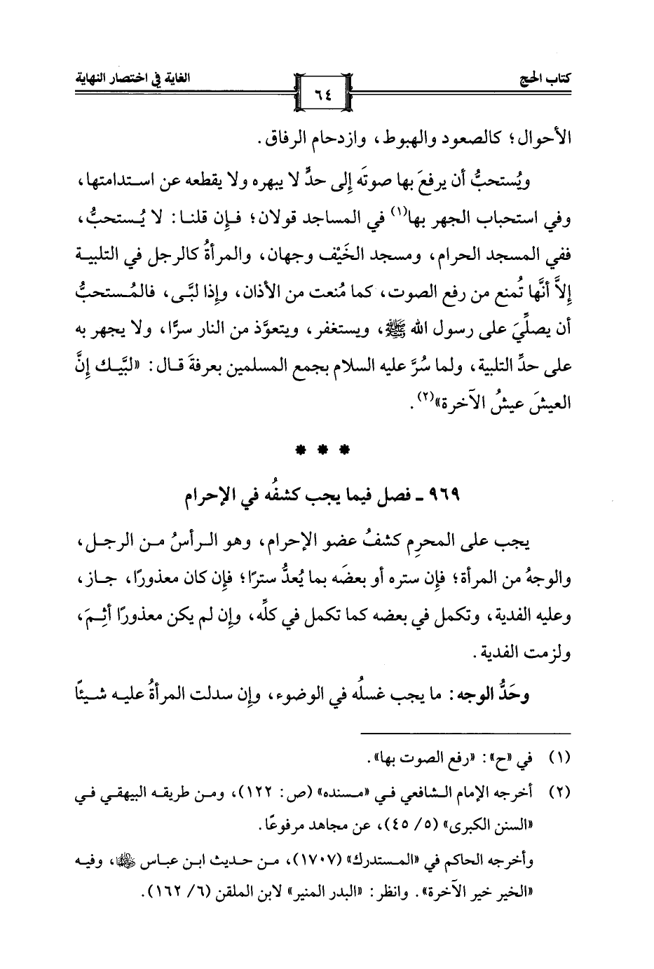 ويُستحبُّ أن يرفعَ بها صوتَه إِلى حدٍّ لا يبهره ولا يقطعه عن استدامتها، وفي استحباب الجهر بها (¬1) في المساجد قولان؛ فإِن قلنا: لا يُستحبُّ، ففي المسجد الحرام، ومسجد الخَيْف وجهان، والمرأةُ كالرجل في التلبية إِلَّا أنَّها تُمنع من رفع الصوت، كما مُنعت من الأذان، وإِذا لبَّى، فالمُستحبُّ أن يصلِّيَ على رسول الله -صلى الله عليه وسلم-، ويستغفر، ويتعوَّذ من النار سرًّا، ولا يجهر به على حدِّ التلبية، ولما سُرَّ عليه السلام بجمع المسلمين بعرفةَ قال: "لبَّيك إِنَّ العيشَ عيشُ الآخرة" (¬2).