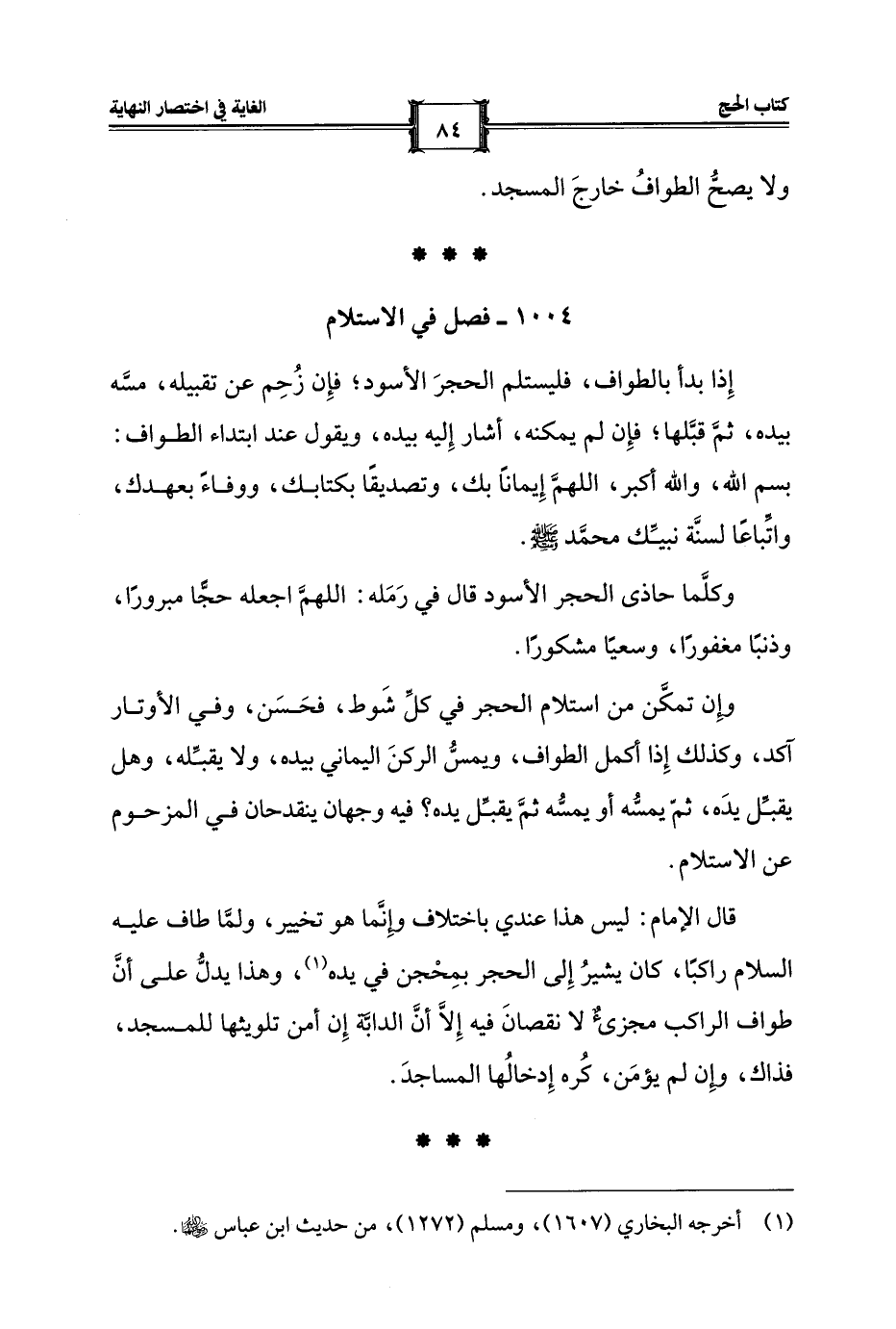 قال الإمام: ليس هذا عندي باختلاف وإِنَّما هو تخيير، ولمَّا طاف عليه السلام راكبًا، كان يشيرُ إِلى الحجر بمِحْجن في يده (¬1)، وهذا يدلُّ على أنَّ طواف الراكب مجزئٌ لا نقصانَ فيه إِلَّا أنَّ الدابّه إِن أمن تلويثها للمسجد، فذاك، وإِن لم يؤمَن، كُره إِدخالُها المساجدَ.