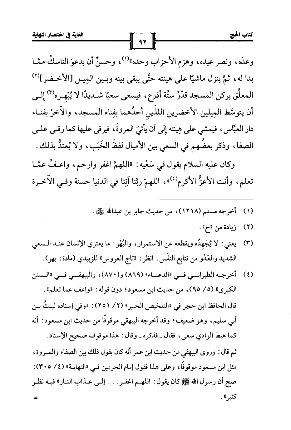 ثم قال: وروى البيهقي من حديث ابن عمر أنه كان يقول ذلك بين الصفاء والمروة، مثل ابن مسعود موقوفًا، وعلى هذا فقول إمام الحرمين في "النهاية" (4/ 305): صح أن رسول الله - صلى الله عليه وسلم - كان يقول: اللهم اغفر ... إلى عذاب النار" فيه نظر كثير". =