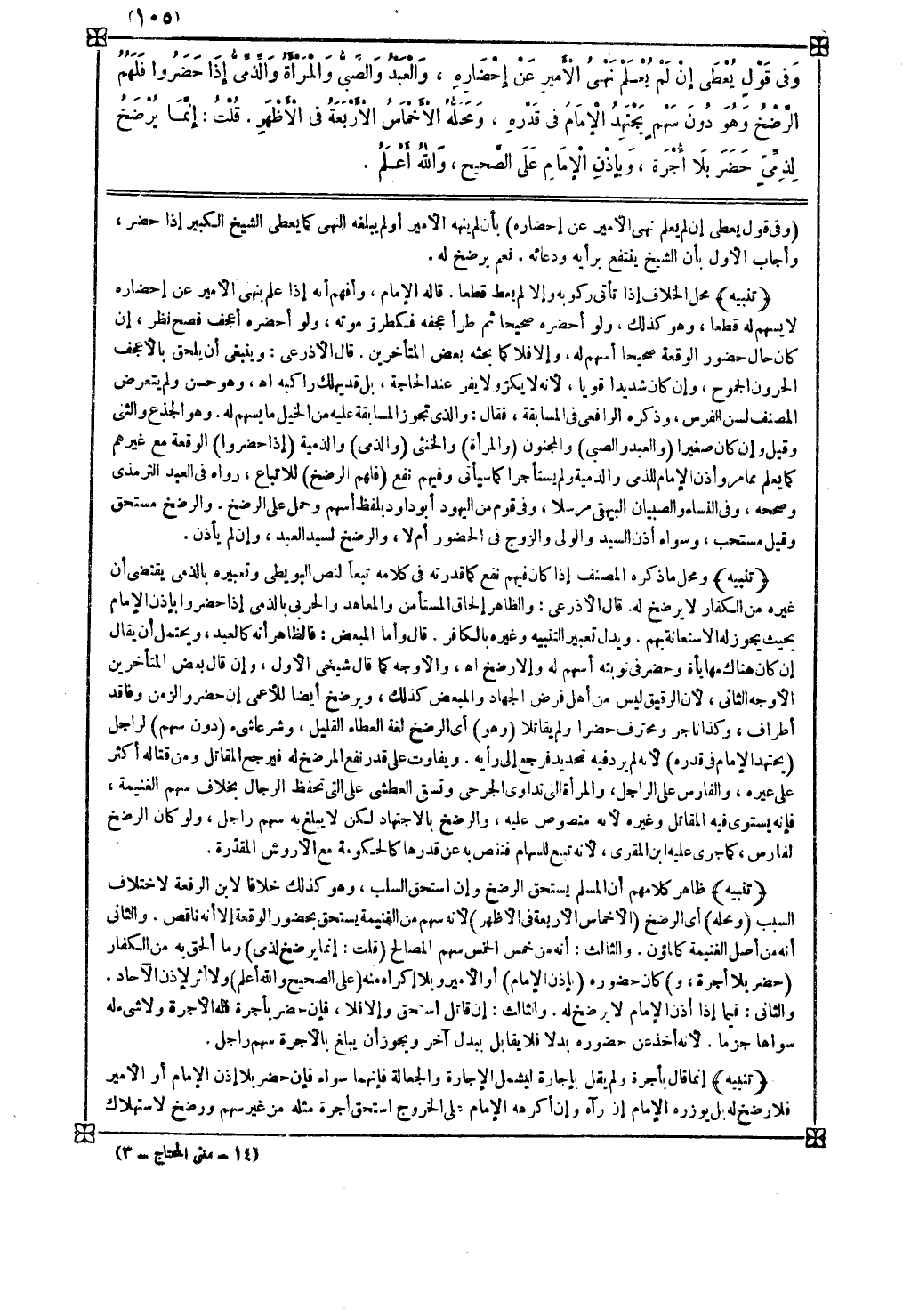 تنبيه إنما قال بأجرة ولم يقل بإجارة ليشمل الإجارة والجعالة فإنهما سواء فإن حضر بلا إذن الإمام أو الأمير فلا رضخ له بل يوزره الإمام إن رآه وإن أكرهه الإمام على الخروج استحق أجرة مثله من غير سهم ورضخ لاستهلاك