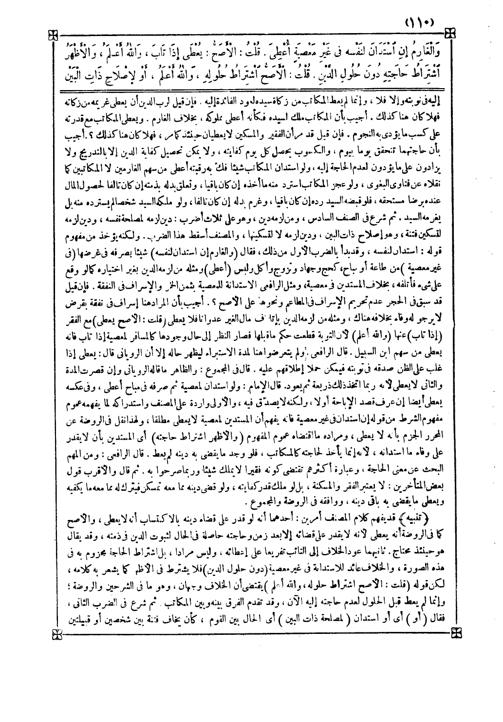 ثم قال والأقرب قول بعض المتأخرين لا يعتبر الفقر والمسكنة بل لو ملك قدر كفايته ولو قضى دينه مما معه تمسكن فيترك له مما معه ما يكفيه ويعطى ما يقضي به باقي دينه ووافقه في الروضة والمجموع