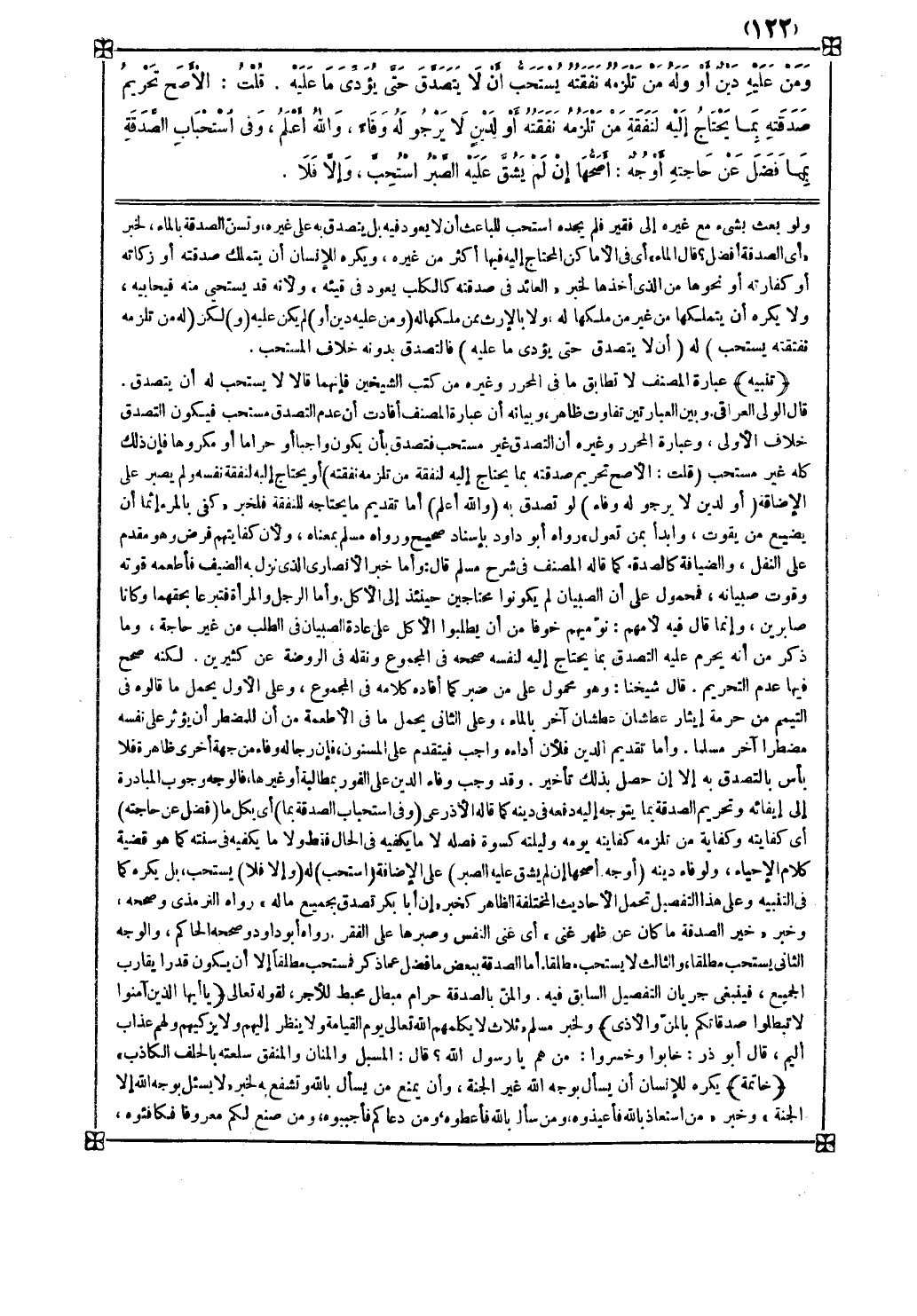 وعلى هذا التفصيل تحمل الأحاديث المختلفة الظاهر كخبر إن أبا بكر تصدق بجميع ماله رواه الترمذي وصححه وخبر خير الصدقة ما كان عن ظهر غنى أي غنى النفس وصبرها على الفقر