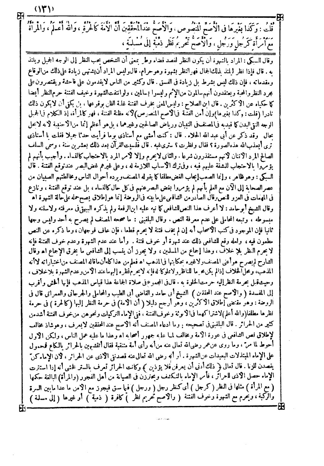 ولو انتفت الشهوة وخيف الفتنة حرم النظر أيضا كما حكياه عن الأكثرين قال ابن الصلاح وليس المعنى بخوف الفتنة غلبة الظن بوقوعها