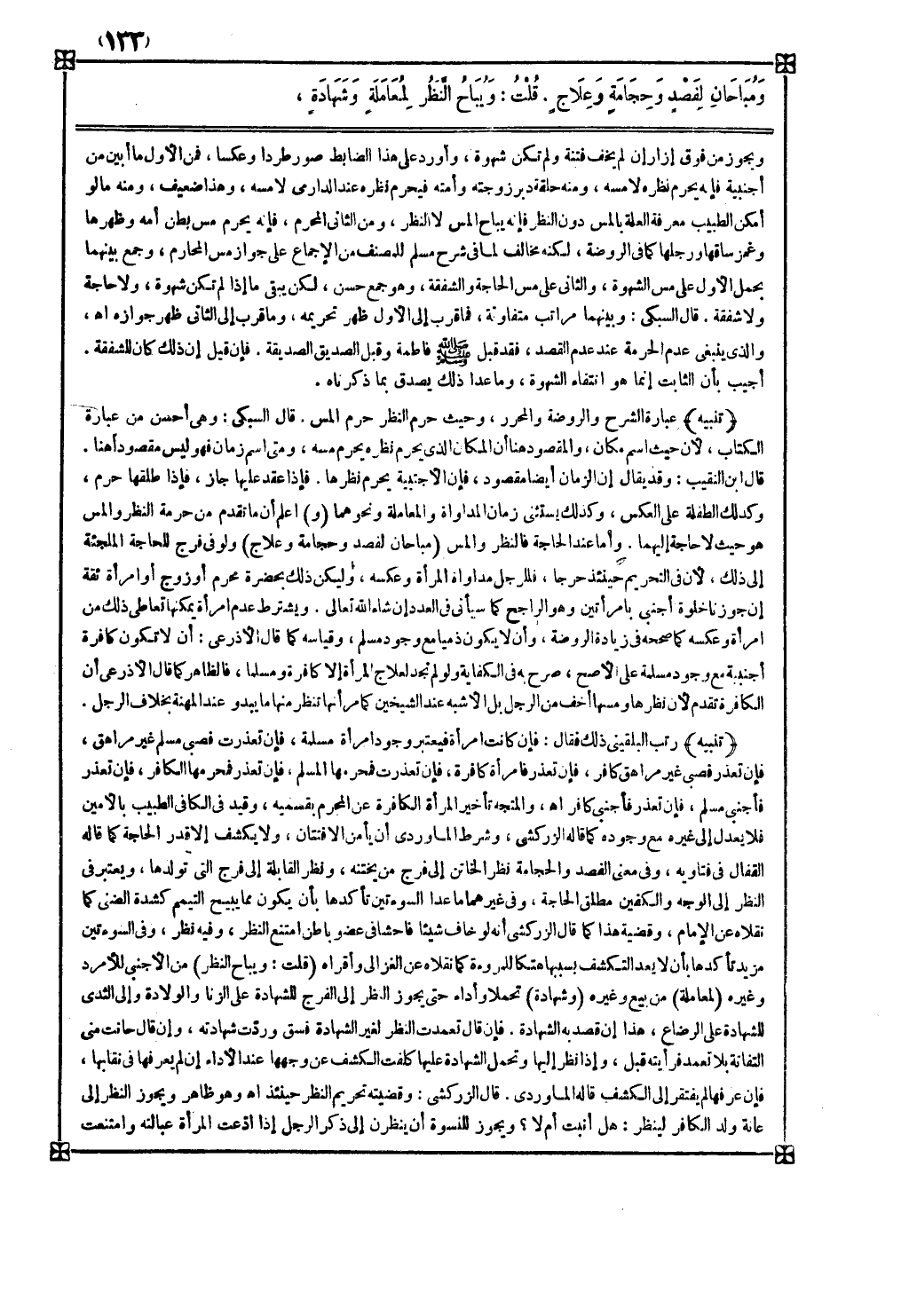 قال ابن النقيب وقد يقال إن الزمان أيضا مقصود فإن الأجنبية يحرم نظرها فإذا عقد عليها جاز فإذا طلقها حرم وكذلك الطفلة على العكس وكذلك يستثنى زمان المداواة والمعاملة ونحوهما