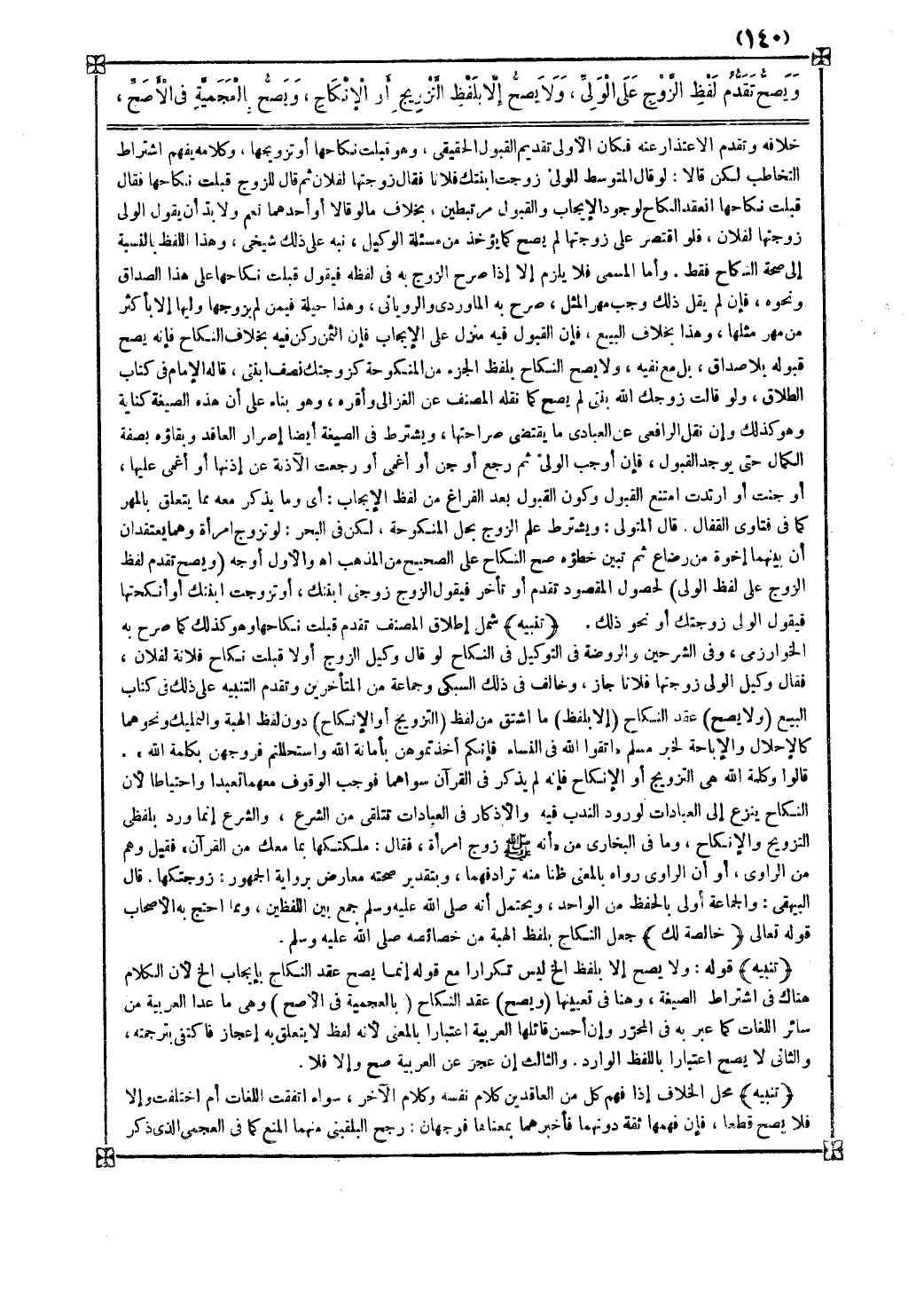 ولا يصح النكاح بلفظ الجزء من المنكوحة ك زوجتك نصف ابنتي قاله الإمام في كتاب الطلاق
