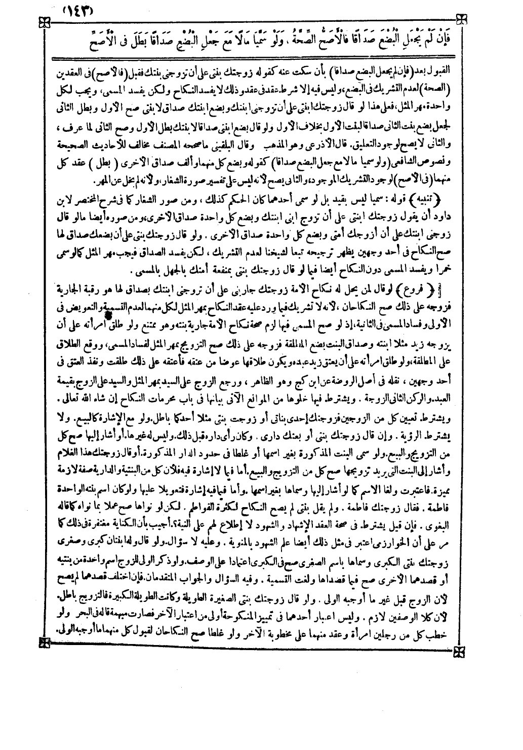 ويشترط تعيين كل من الزوجين ف زوجتك إحدى بناتي أو زوجت بنتي مثلا أحدكما باطل ولو مع الإشارة كالبيع ولا يشترط الرؤية