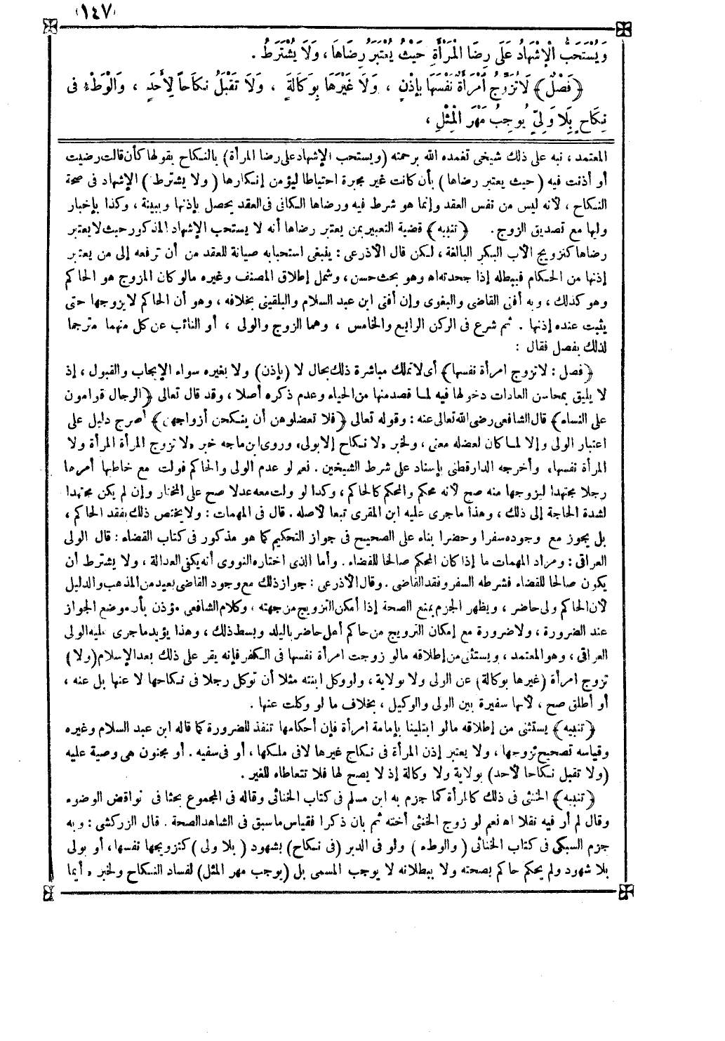 ليه قضية التعبير بمن يعتبر رضاها أنه لا يستحب الإشهاد المذكو حيث لا يعتبر رضاها كتزويج الأب البكر البالغة لكن قال الأذرعي ينبغي استحبابه صيانة للعقد من أن ترفعه إلى من يعتبر إذنها من الحكام فيبطله إذا جحدته اه