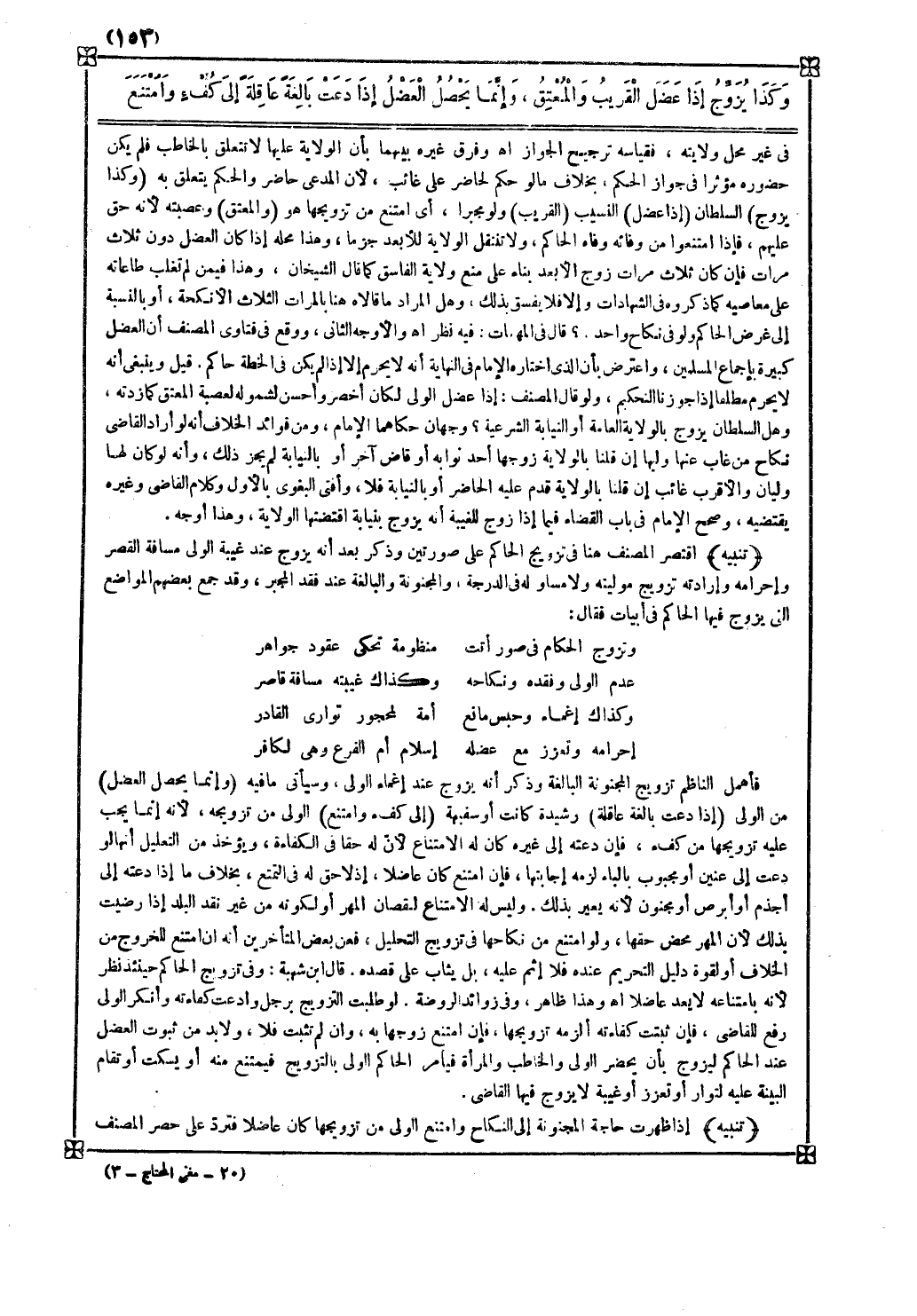 تنبيه اقتصر المصنف هنا في تزويج الحاكم على صورتين وذكر بعد أنه يزوج عند غيبة الولي مسافة القصر وإحرامه وإرادته تزويج موليته ولا مساو له في الدرجة والمجنونة والبالغة عند فقد المجبر وقد جمع بعضهم المواضع التي يزوج فيها الحاكم في أبيات فقال وتزوج الحكام في صور أتت منظومة تحكي عقود جواهر عدم الولي وفقده ونكاحه وكذاك غيبته مسافة قاصر وكذاك إغماء وحبس مانع أمة لمحجور توارى القادر إحرامه وتعزز مع عضلة إسلام أم الفرع وهي لكافر فأهمل الناظم تزويج المجنونة البالغة وذكر أنه يزوج عند إغماء الولي وسيأتي ما فيه
