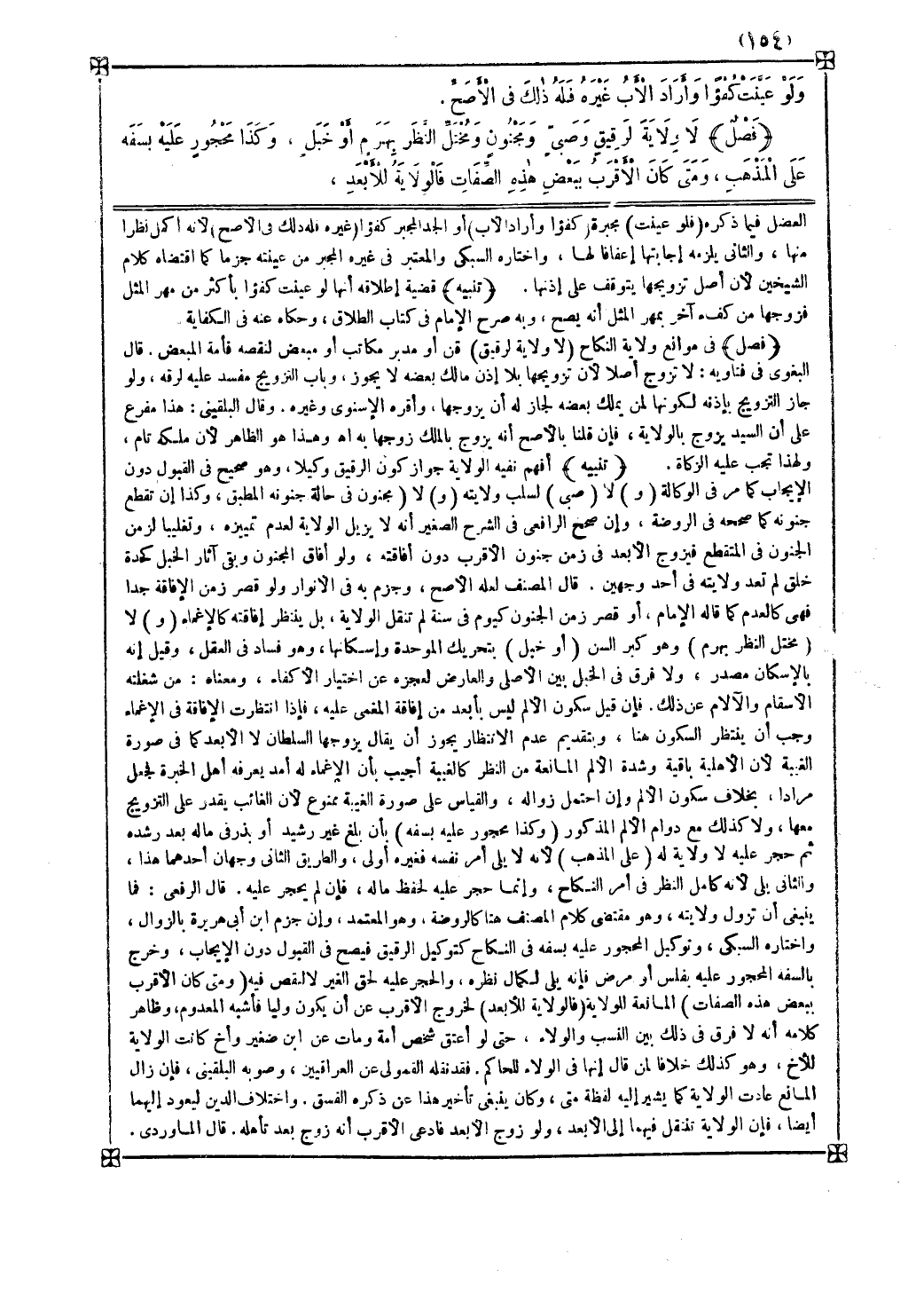 ( و ) لا ( صبي ) لسلب ولايته ( و ) لا ( مجنون ) في حالة جنونه المطبق وكذا إن تقطع جنونه كما صححه في الروضة وإن صحح الرافعي في الشرح الصغير أنه لا يزيل الولاية لعدم تمييزه وتغليبا لزمن الجنون في المتقطع فيزوج الأبعد في زمن جنون الأقرب دون أفاقته